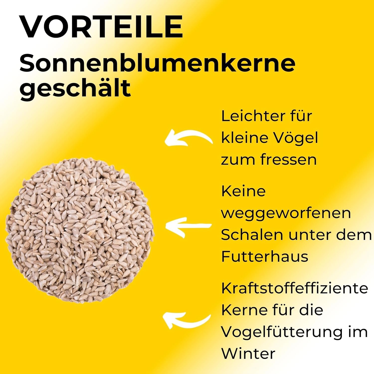 Geschälte Sonnenblumenkerne eignen sich hervorragend für Wild- und Gartenvögel wie Stieglitze, Meisen, Amseln, Erlenzeisige und Grünfinken. Auch andere Vogelarten und Nutztiere können davon profitieren.