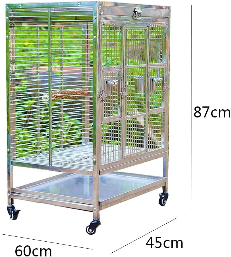 Dieser aus robustem Metall gefertigte Vogelkäfig verfügt über eine elegante Silberfarbe, die sich nahtlos in jede Inneneinrichtung einfügt. Mit den Maßen 60 x 45 x 87 cm und einem Gewicht von 24 kg bietet es Ihren gefiederten Freunden viel Platz zum Bewegen und Ausbreiten ihrer Flügel.