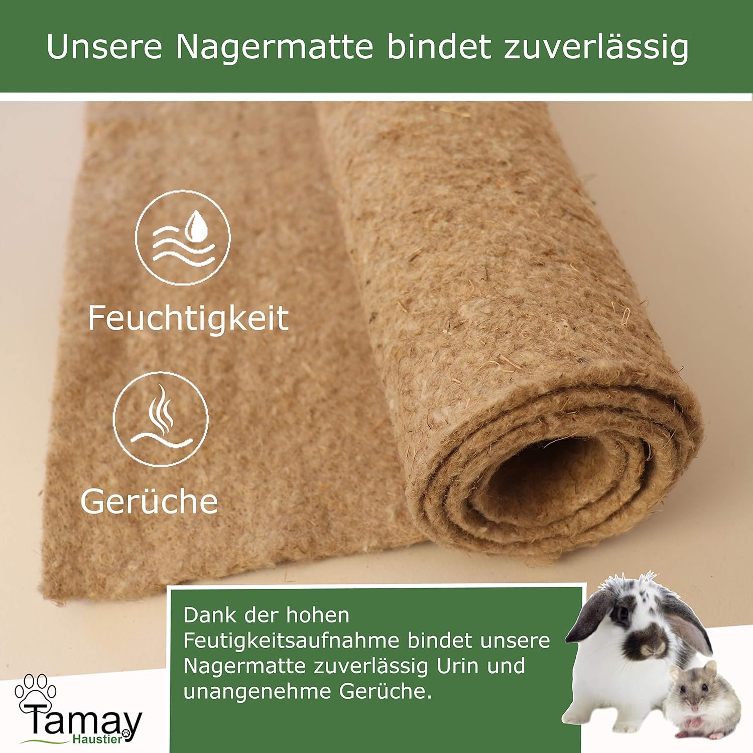Mit unseren Nagermatten aus 100 % Hanf schaffen Sie eine trockene, natürliche Unterlage für Ihren Liebling. Dank der feuchtigkeits- und geruchsbindenden Eigenschaften entsteht ein angenehmes Klima für Mensch und Tier.