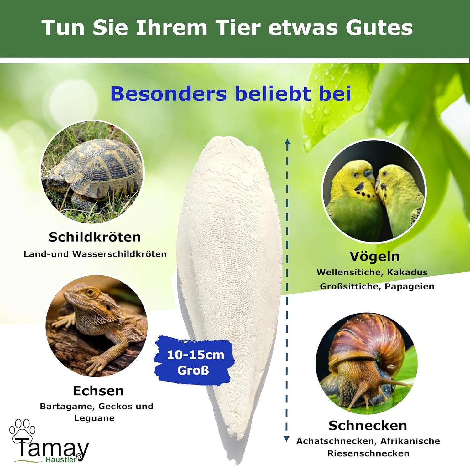 Ideal für einen gesunden Panzer- und Knochenaufbau – besonders wichtig für den Panzeraufbau bei jungen Reptilien und für die Eierschalenbildung bei Weibchen. Dient auch als natürliche Schnabelpflege und sorgt so für eine optimale Abnutzung des Schnabels Ihres Vogels – der bessere Kalkstein.