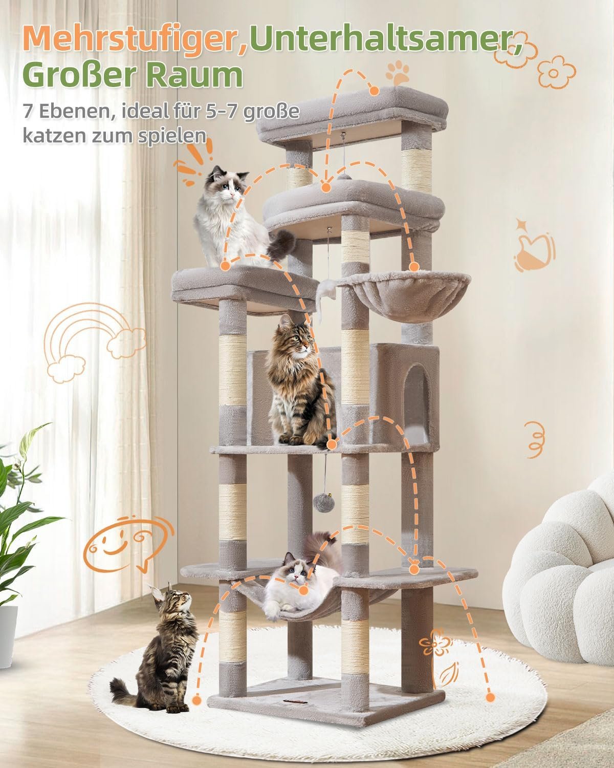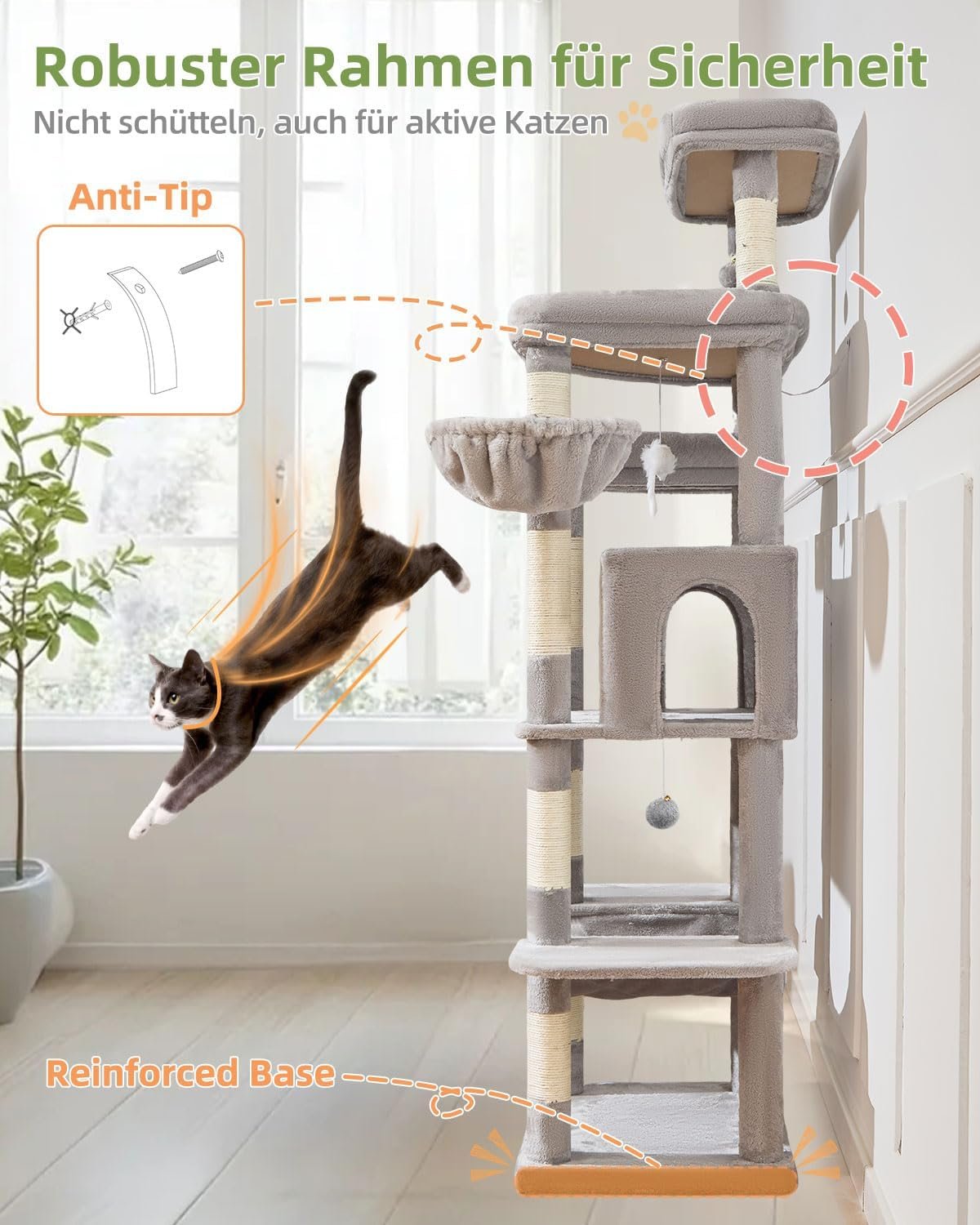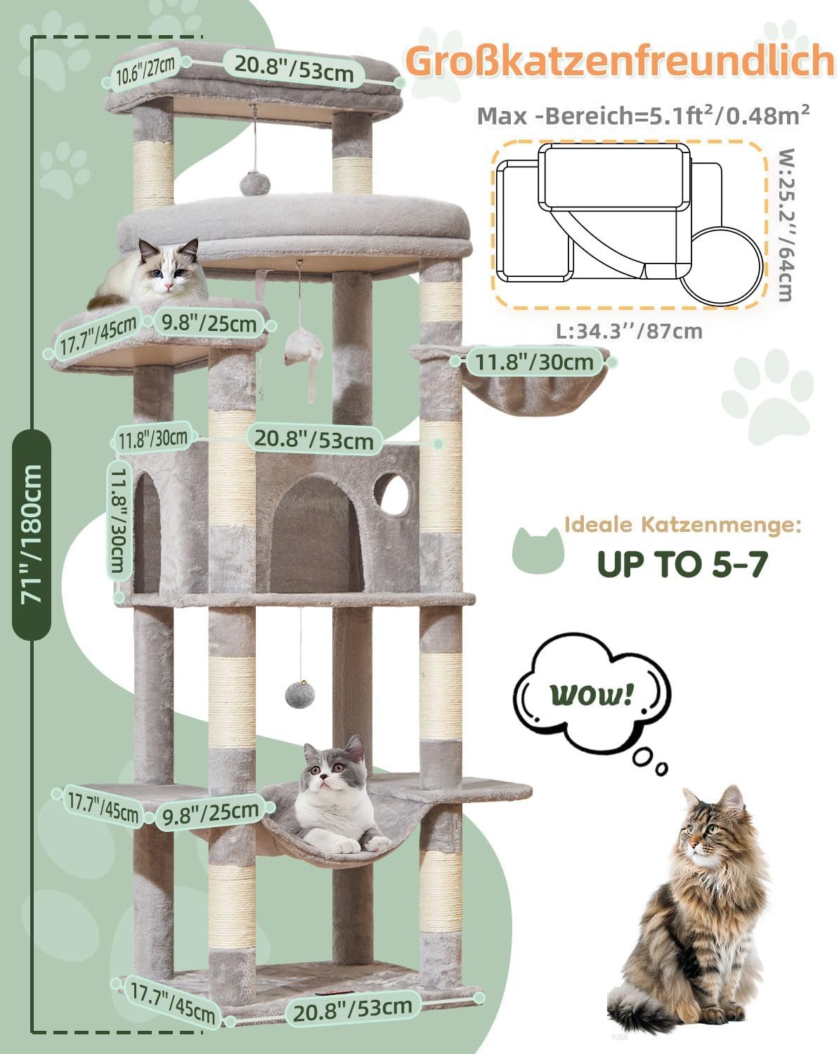 【180 cm – 6-stufige stabile Struktur】: Dieser Kratzbaum ist 180 cm hoch und verfügt über 6 Ebenen, die für die Unterstützung großer Katzen ausgelegt sind. Sein stabiler Standfuß verhindert ein Umkippen und eignet sich daher ideal zum aktiven Klettern und Faulenzen.