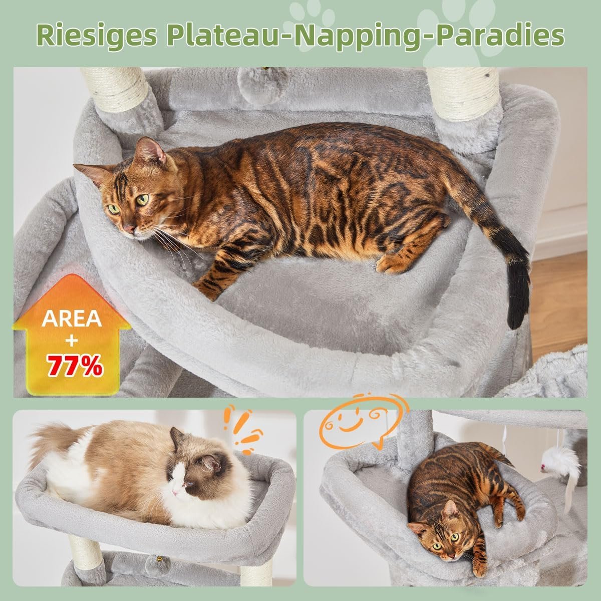 【Erweiterte Ruhezone】: Das große, extra breite Design des Kratzbaums ermöglicht es großen/XL-Katzen, sich vollständig auszustrecken, mit einer weichen Innenseite, die für gemütlichen Schlaf sorgt – keine beengten Nickerchen mehr!