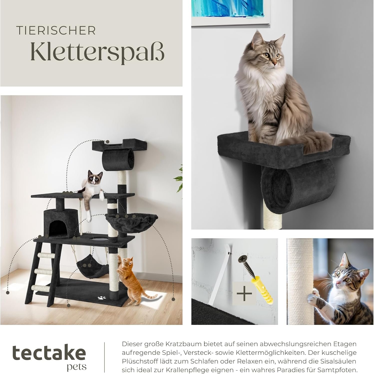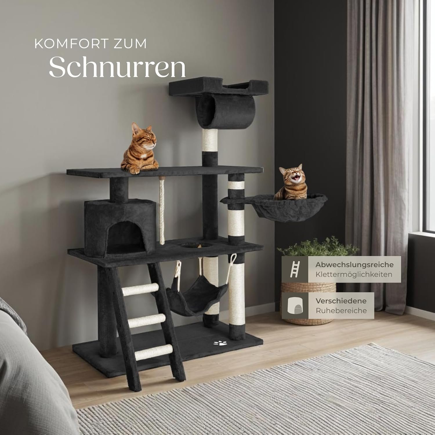 Awaken the curiosity of your velvet paw with our varied and versatile scratching post The columns are wrapped with the durable natural material sisal, on which your cat can optimally sharpen and care for its claws. Multiple platforms as well as play and hiding options offer plenty of room to romp, discover and relax.