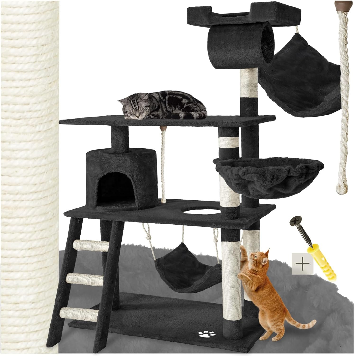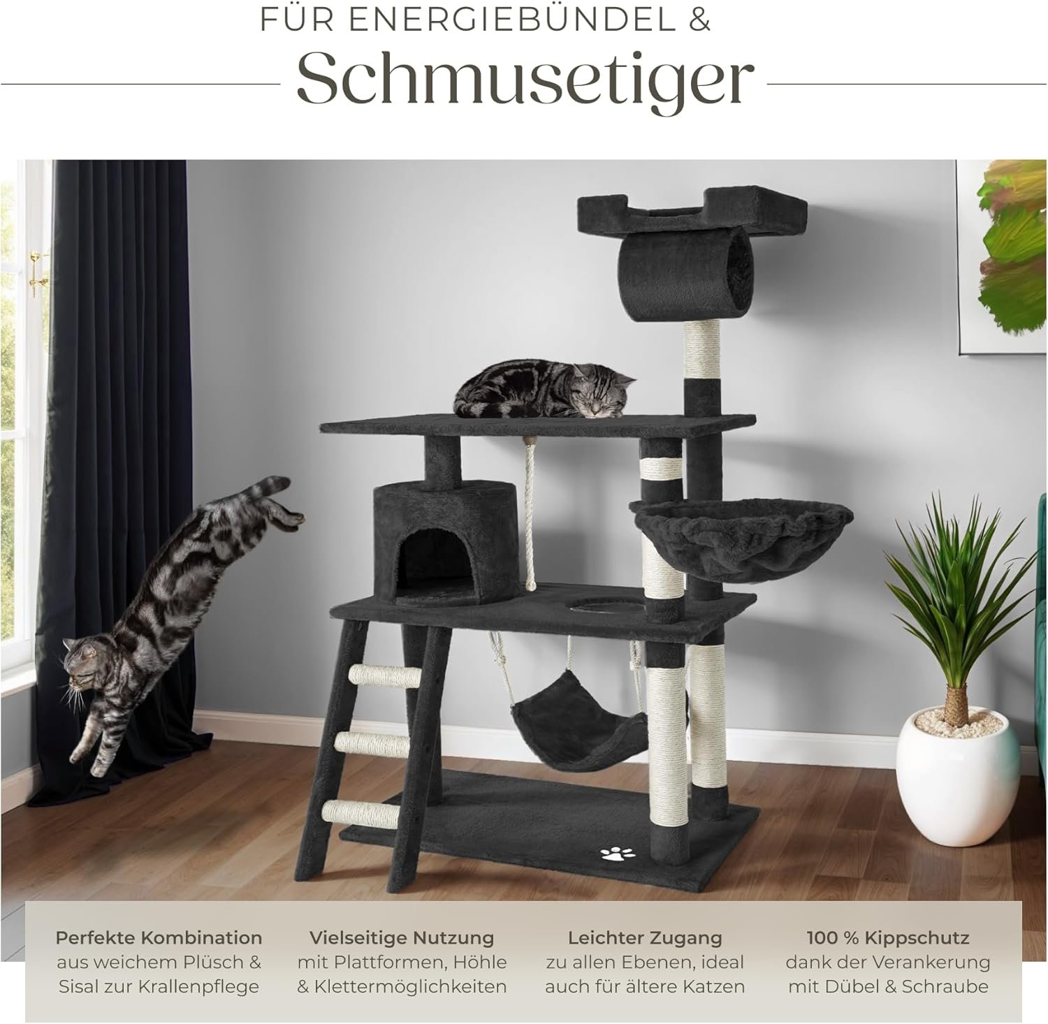Highlights Large viewing platform at 141 cm height Durable plush sisal combo Tilt protection for maximum safety Fluffy cat hammock Beautiful cuddly cave with stairs Lounger for rolling up Tube for hiding Integrated play cord