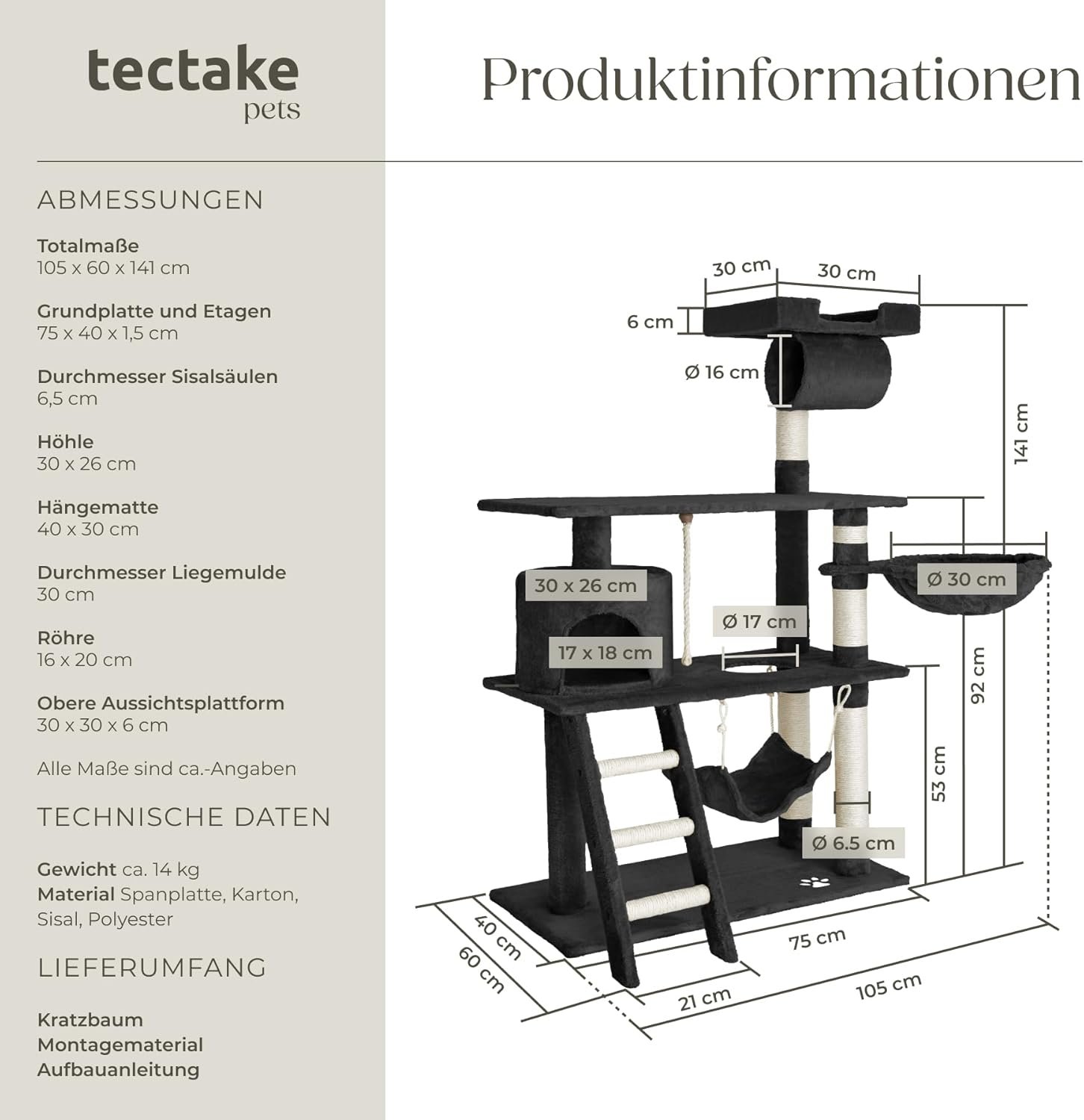 Total dimensions (L x W x H): approx. 105 x 60 x 141 cm. Base plate and shelves (L x W x H): approx. 75 x 40 x 1.5 cm. Sisal columns: approx. Diameter 6.5 cm. Cave (diameter x height): approx. 30 x 26 cm / opening (W x H): approx. 17 x 18 cm. Hammock (L x W): approx. 40 x 30 cm. Lounger: approx. Diameter 30 cm. Tube (diameter x length): approx. 16 x 20 cm. Top viewing platform (L x W x H): approx. 30 x 30 x 6 cm