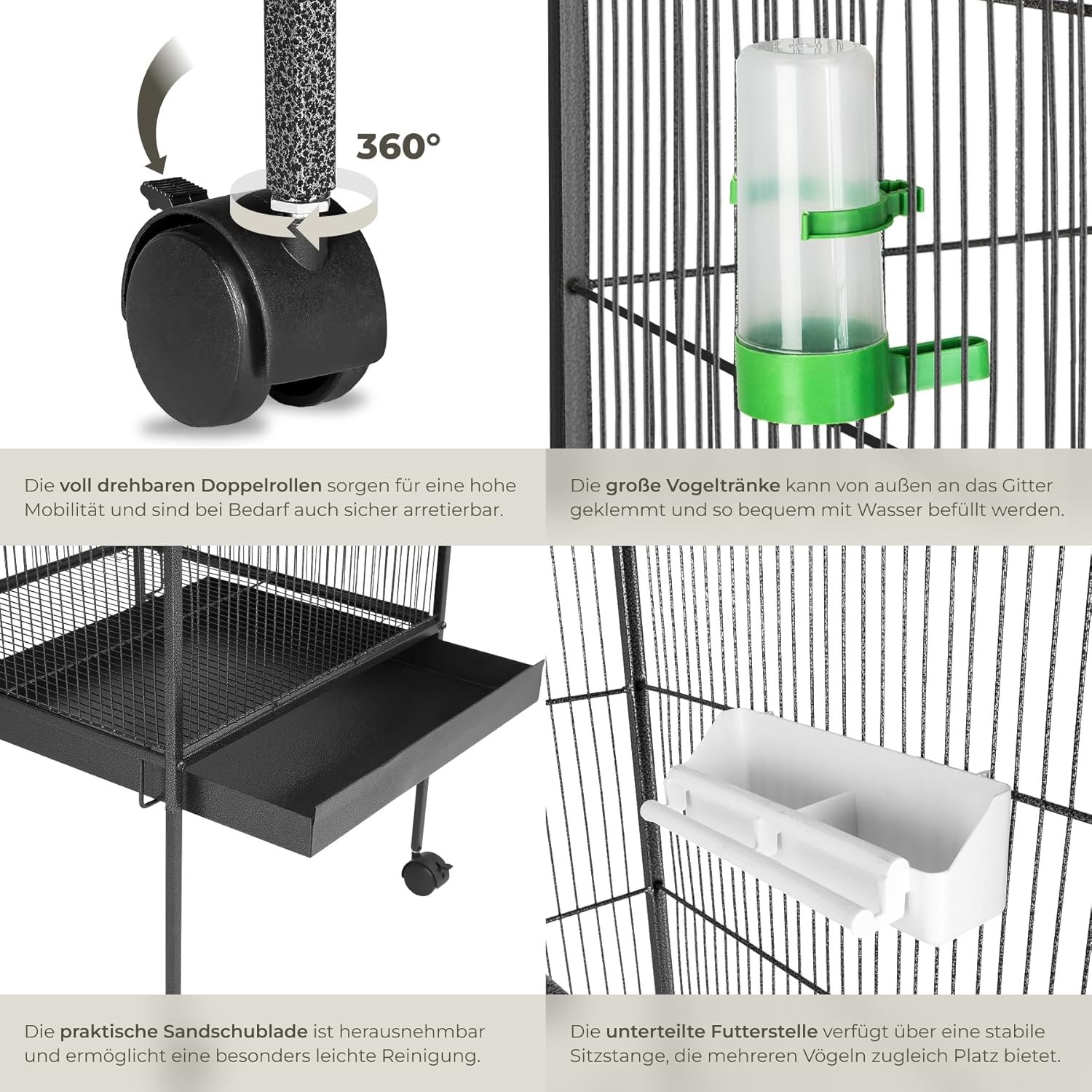 Vogelkäfig mit flexiblem Aufbau und komfortabler Ausstattung: Unsere Vogelkäfige verfügen über drei individuell nutzbare Sitzstangen, die nach Belieben im XXL-Vogelkäfig platziert werden können. Darüber hinaus sorgt das Bodengitter für eine saubere Umgebung, während die Sandschublade das Ersetzen des Bodensands erleichtert, während Ihr Vogel im Käfig bleibt. Ideal als kleiner Papageienkäfig, für Finken- und Wellensittichkäfige.