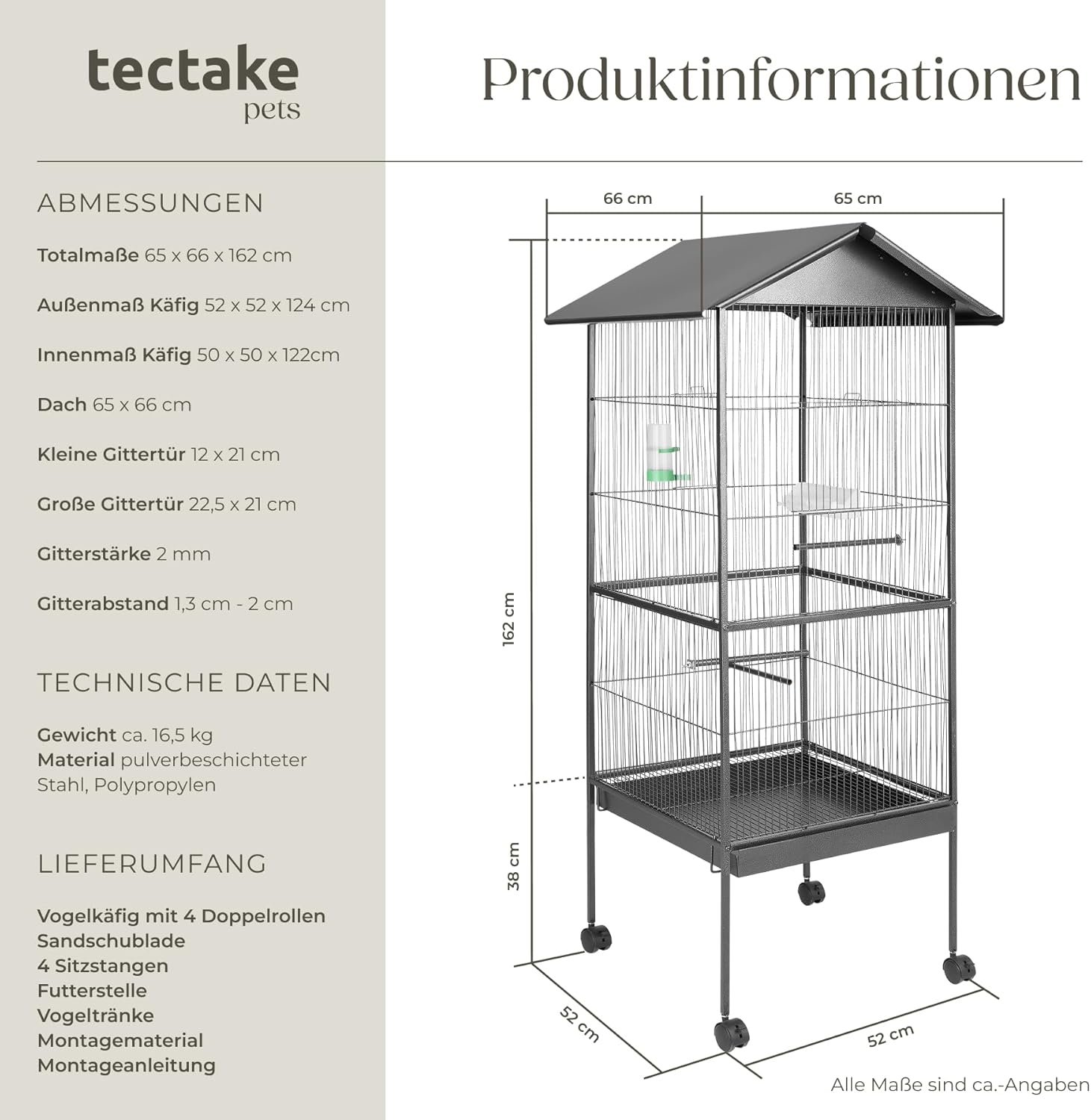 Außenmaße des Käfigs (H x B x T): 124 x 52 x 52 cm.