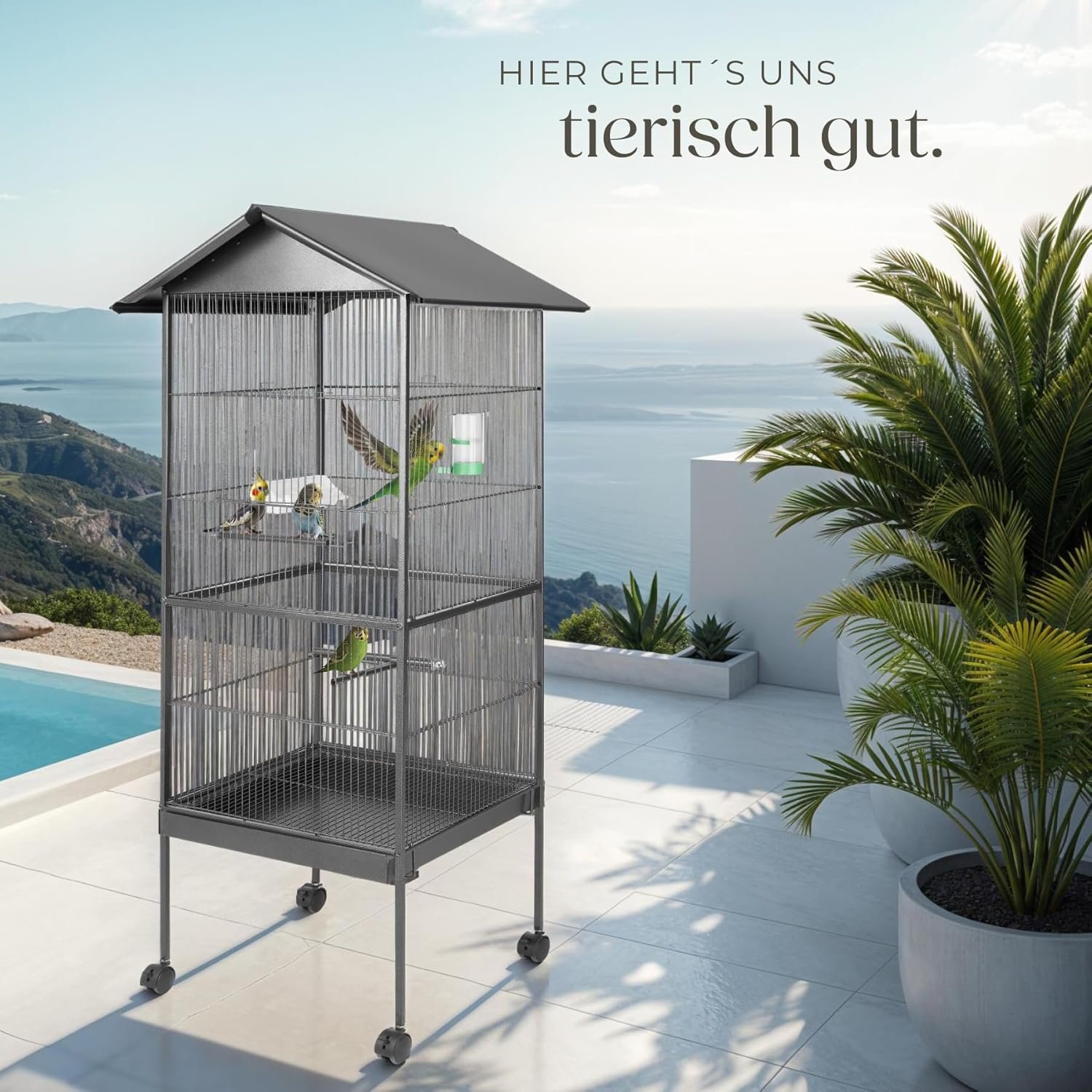 XXL-Vogelkäfig, leicht zu bewegen und stabile Ausführung: Die arretierbaren Rollfüße ermöglichen ein einfaches Bewegen des Käfigs. Die Hammerschlagoptik in Silber-Anthrazit sorgt für einen stilvollen Look. Ob als Käfig für Wellensittiche, für Alexandersittiche, kleine Papageien oder Zebrafinken – dieses Modell überzeugt durch Funktionalität und Design.