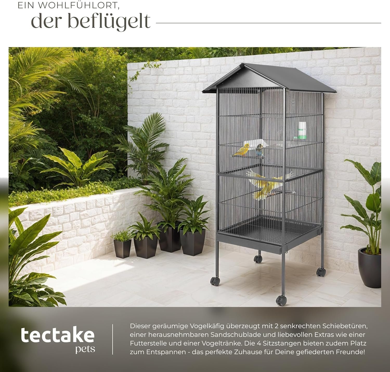 Geräumige, voluminöse Vögel für mehr Freiheit: Der rechteckige Vogelkäfig mit Ständer auf Rollen bietet kleinen Papageien wie Wellensittichen oder Sittichen viel Platz zum Fliegen und als Vogelspielplatz. Durch den geringen Gitterabstand ist er perfekt für kleinere Vogelarten, der ideale Kanarienkäfig.