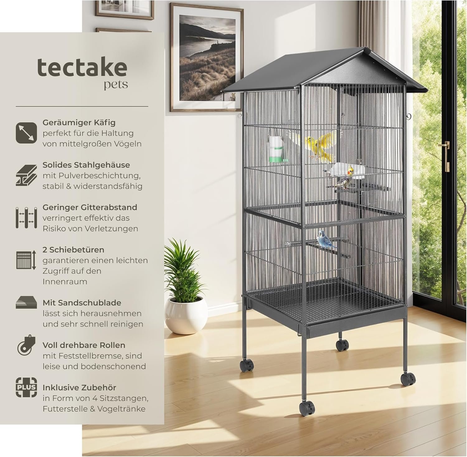 Großer Vogelvogel mit praktischen Schiebetüren und großem Futterplatz: Zwei vertikale Schiebeöffnungen ermöglichen einen einfachen Zugang zur Vogelvoliere im Inneren. Die große Futterstation mit integrierter Sitzstange sorgt dafür, dass Ihre Vögel bequem fressen können. Ergänzt durch einen zusätzlichen Wasserspender für eine optimale Versorgung.