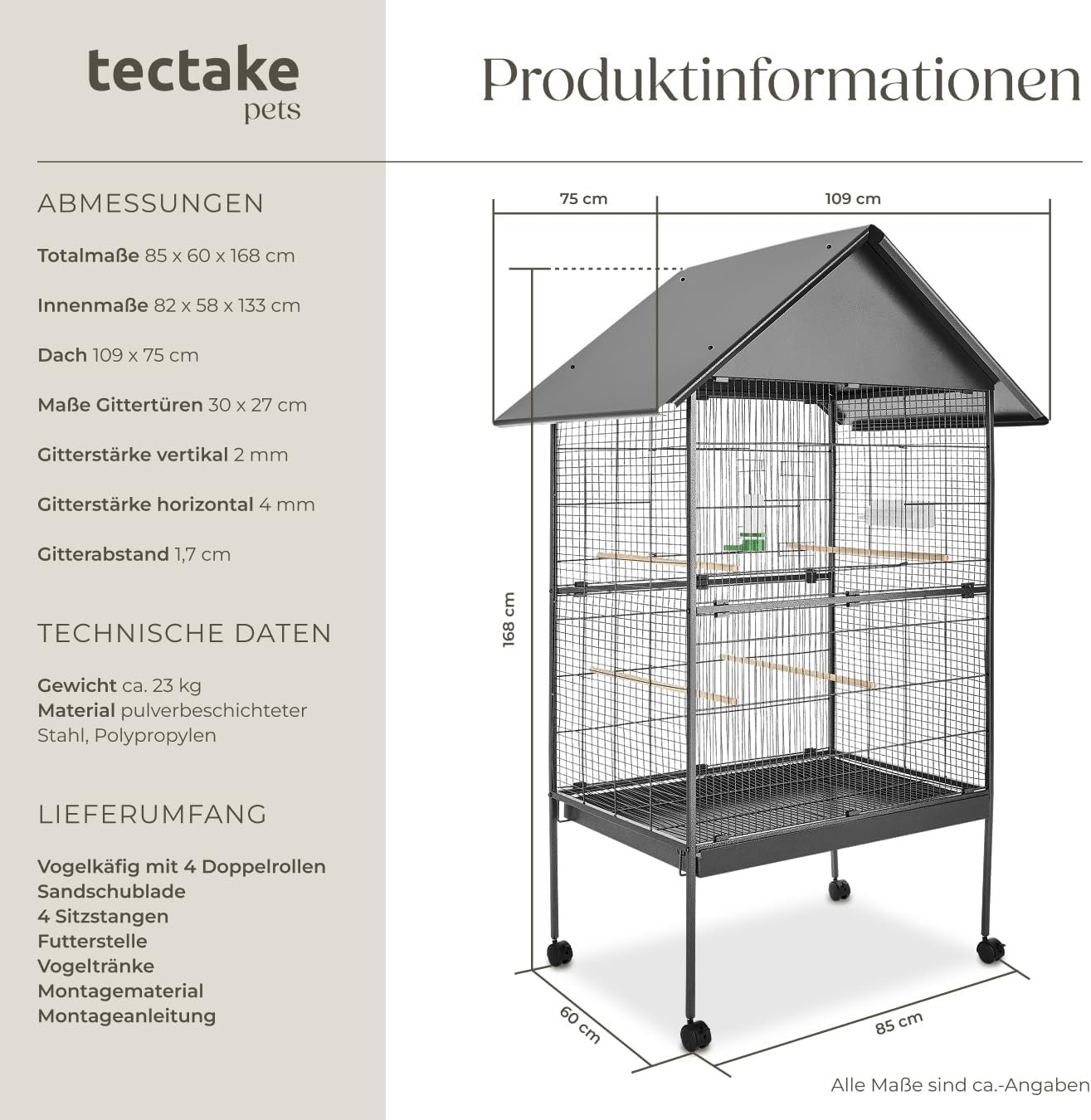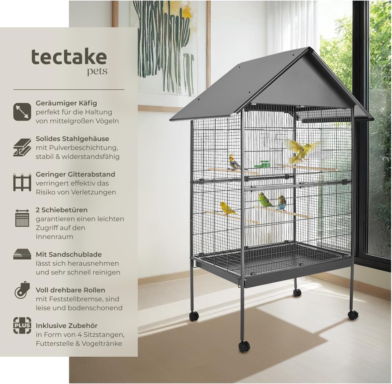 Dieser formschöne Vogelkäfig mit Spitzdach von tectake ist ein ideales Zuhause für alle Vögel, die gerne klettern und spielen. Der geräumige Käfig bietet artgerechten Komfort.
