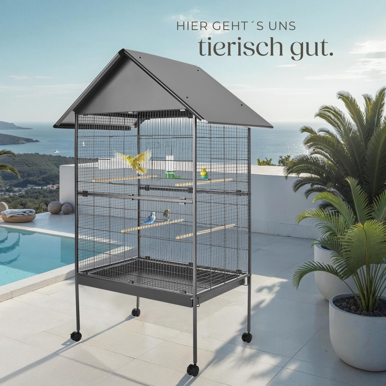 Geräumige, voluminöse Vögel für mehr Freiheit: Der rechteckige Vogelkäfig mit Ständer auf Rollen bietet kleinen Papageien wie Wellensittichen oder Sittichen viel Platz zum Fliegen und als Vogelspielplatz. Der geringe Gitterabstand sorgt für ein geringes Verletzungsrisiko – der ideale Kanarienkäfig.