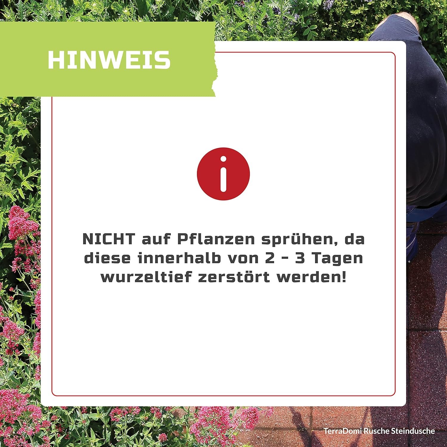 Bitte beachten Sie: Der Reiniger dient der Pflege von Wegen und Plätzen und sollte nicht als Unkrautvernichter verwendet werden, da Pflanzen, Unkraut, Rasen und Grasland innerhalb von 2-3 Tagen verdorren und absterben.
