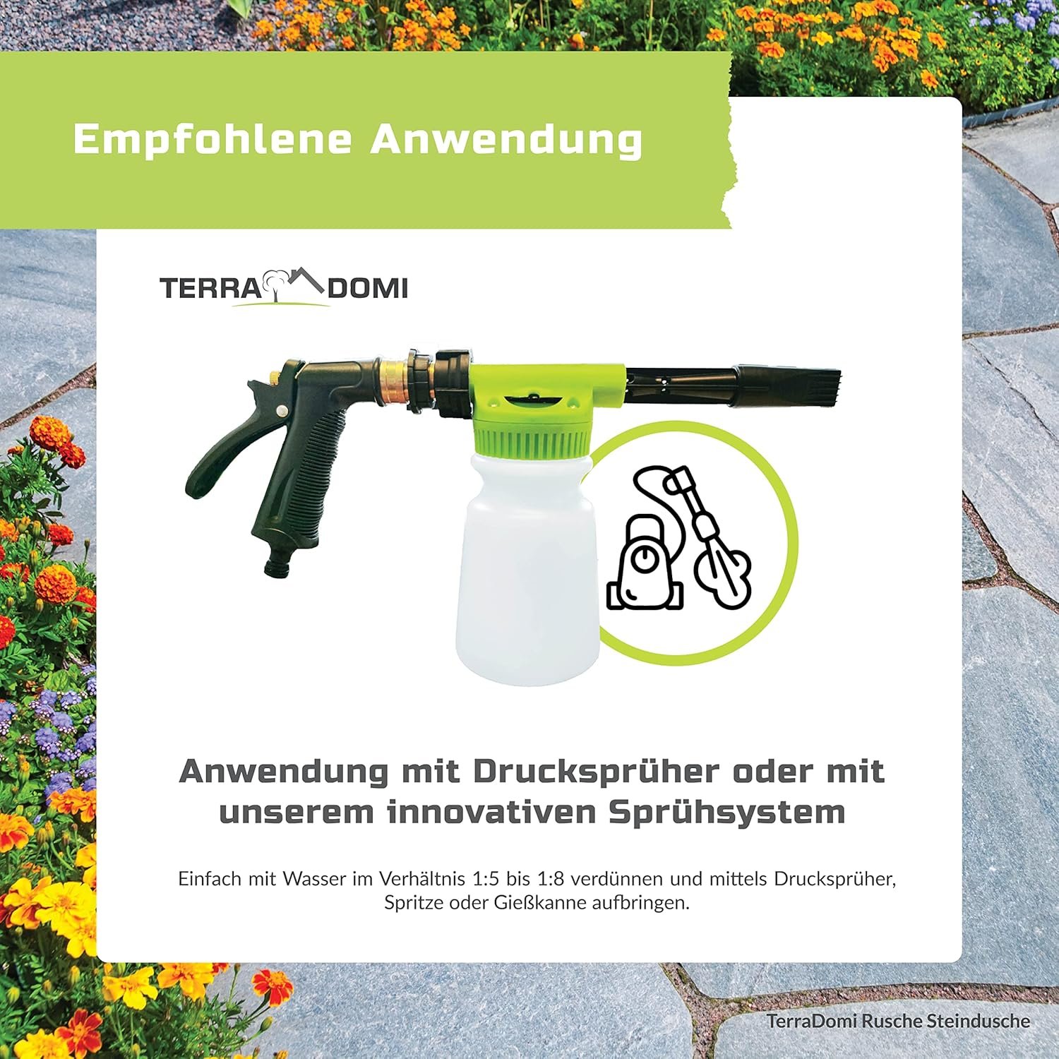 Das Original von TerraDomi: Rusche Stone Shower Cleaner ist das universelle Reinigungsmittel für ein perfektes Haus und Garten – Ihre Wege, Kieselsteine, Fliesen und Steinplatten wurden noch nie so sauber gestrahlt.