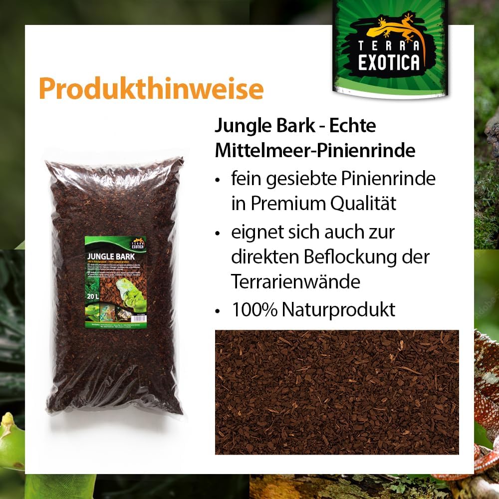 Dschungelrinde – das ideale Substrat für tropische Eidechsen, Schlangen, Amphibien und Schildkröten. Die rötliche Kiefernrinde schafft ein natürliches Milieu und erhöht die Luftfeuchtigkeit in Regenwaldterrarien. Perfekt für die artgerechte Haltung Ihrer exotischen Tiere.