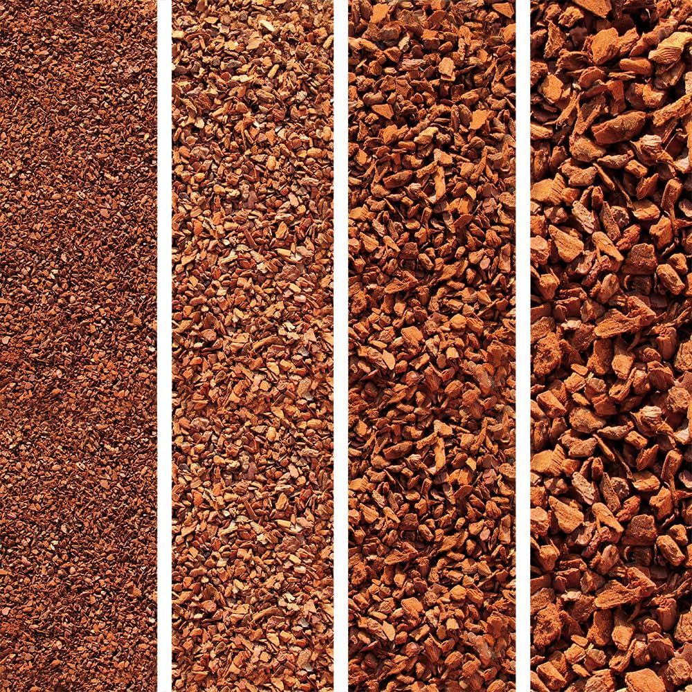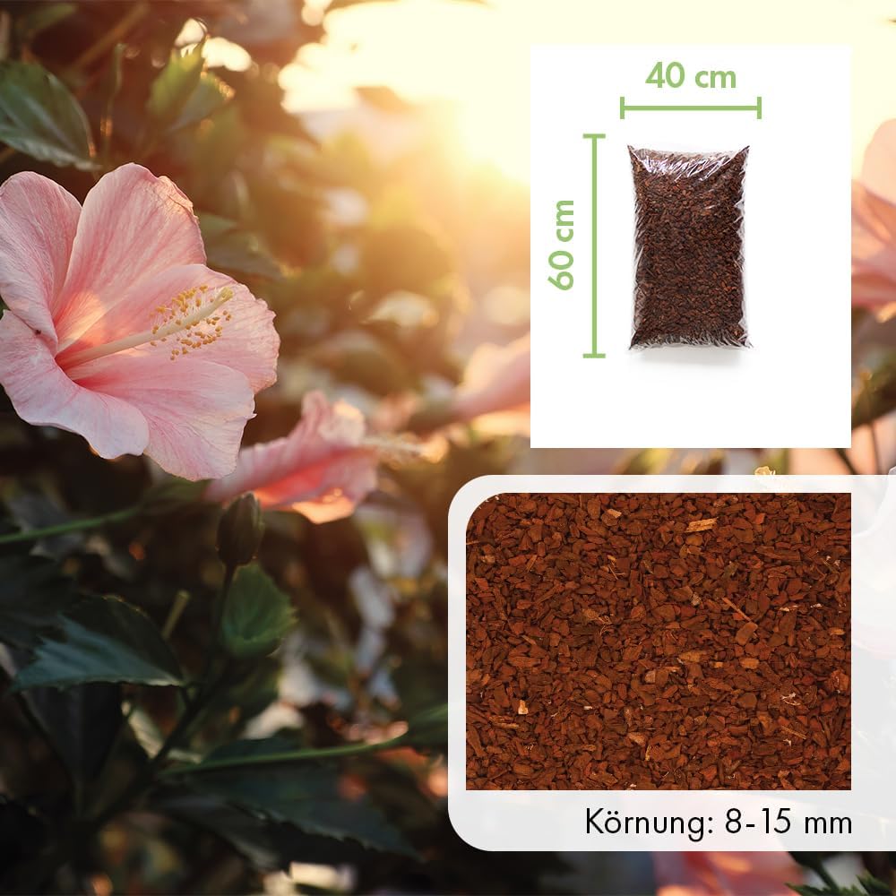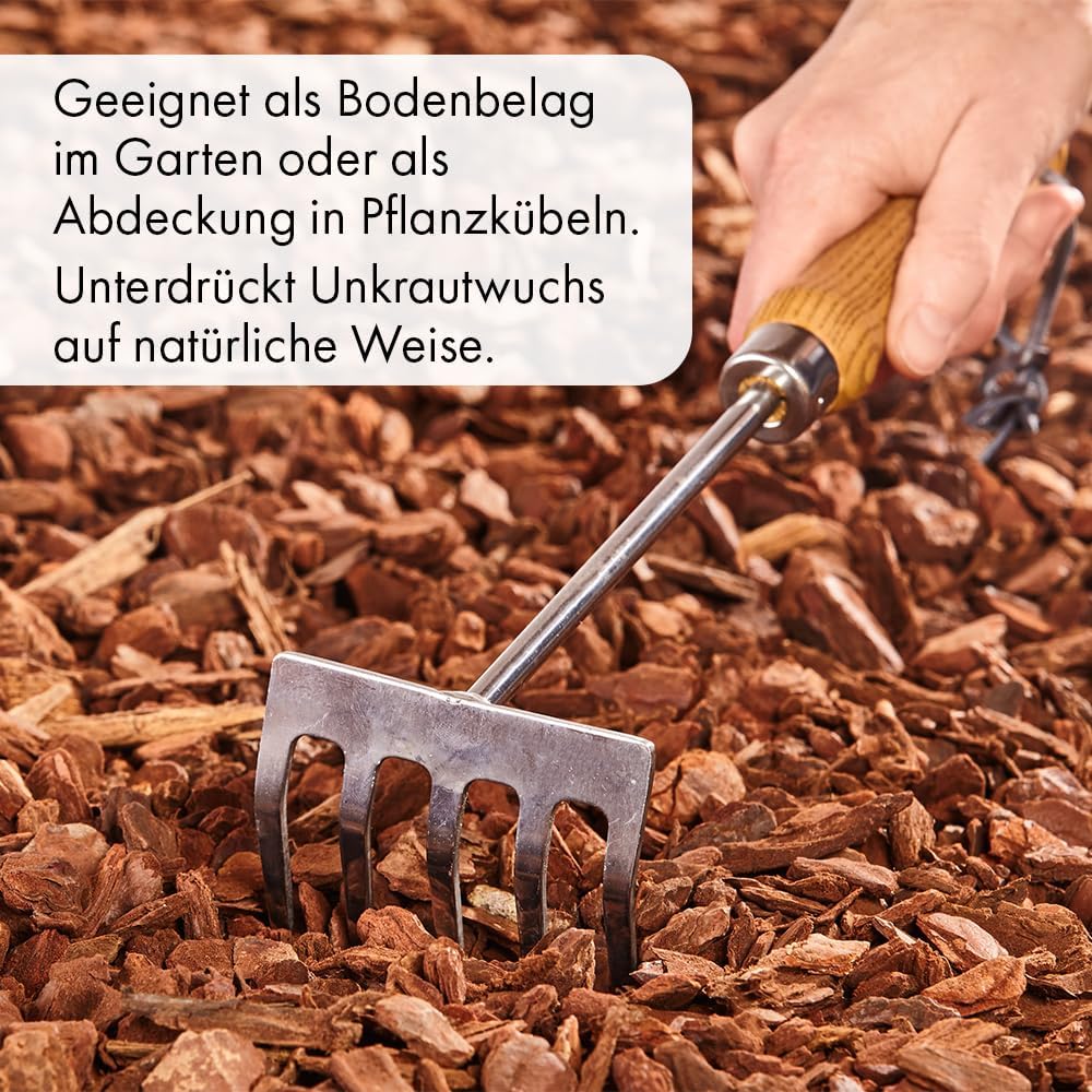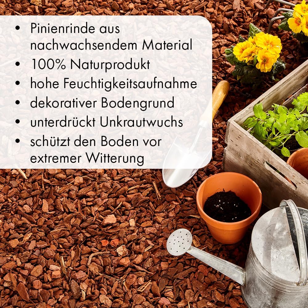 Wertvolle und strukturstabile Kiefernrinde in drei verschiedenen Körnungen, ideal für die dekorative Gartengestaltung, zum Abdecken von z. B. Blumenbeeten, zur Unkrautunterdrückung und zum Schutz vor Erosion und Verdämmung, mit bestem Verdunstungsschutz für Böden.