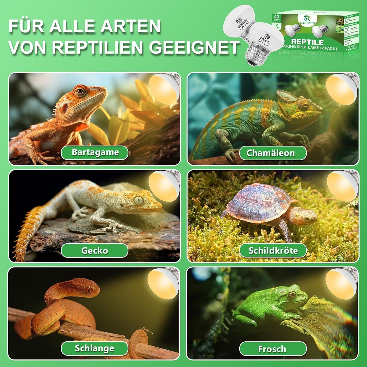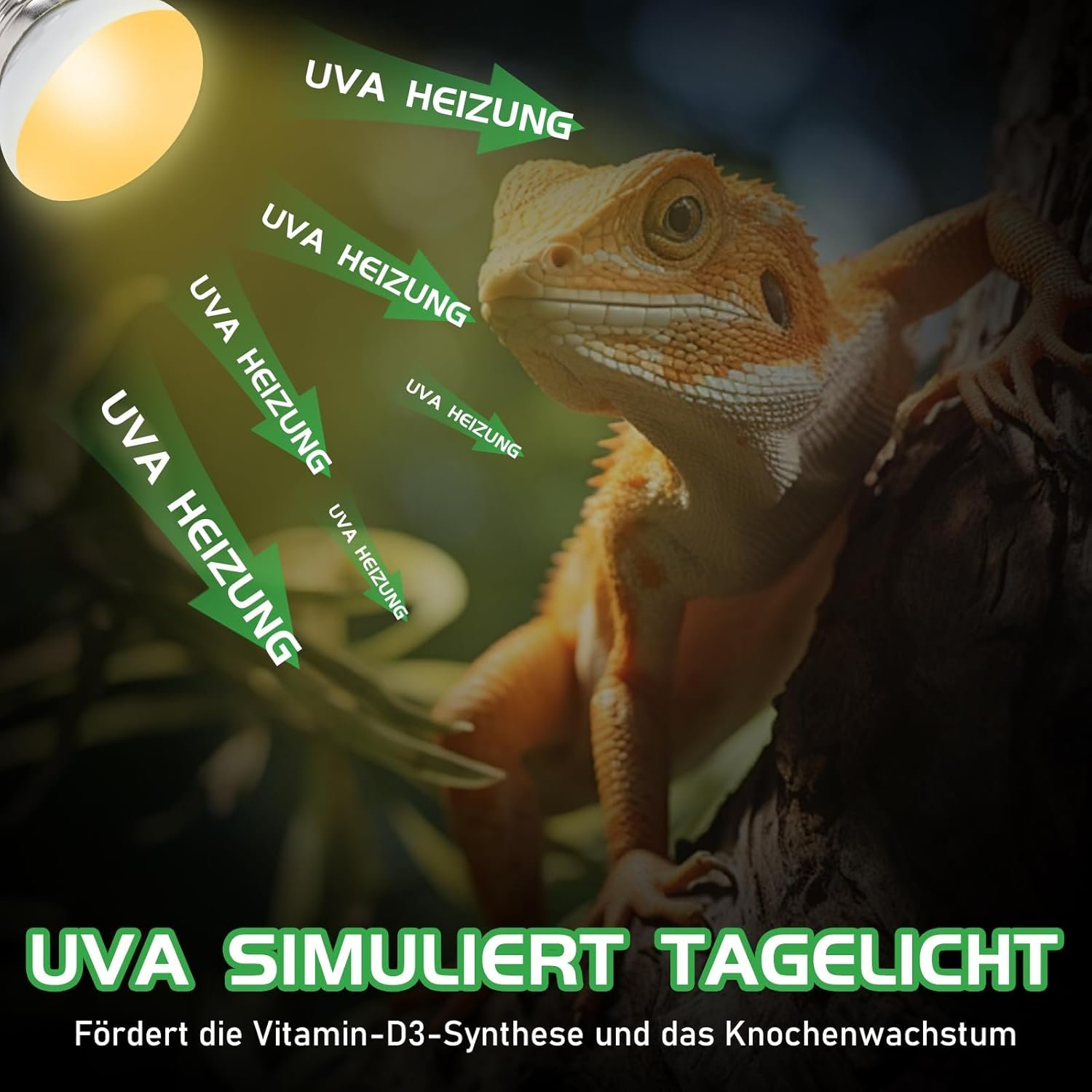 Effektive UVA-Strahlung: Diese kleinen Wärmelampenstrahler enthalten viel UVA-Licht, das die Vitamin-D3-Synthese und das Knochenwachstum bei Reptilien fördert, den Appetit verbessert und für ein gesundes Wachstum Ihrer Reptilien sorgt.