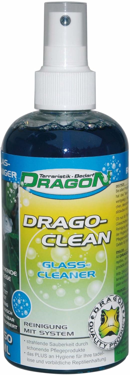 Die Tiere laufen nachts auf einem Wanderschacht an den Fenstern entlang und entledigen sich ihres Geschäftes. Kot kann sehr hartnäckig sein, insbesondere wenn er getrocknet ist. Der Drago Clean bietet eine Lösung. Einfach aufsprühen, kurz einwirken lassen und mit einem Stück Küchenpapier abwischen. Sie müssen den Pool also nicht alle paar Wochen unter die heiße Dusche stellen. Ihre Tiere haben immer saubere Fenster und Sie haben einen perfekten Einblick in das Terrarium.