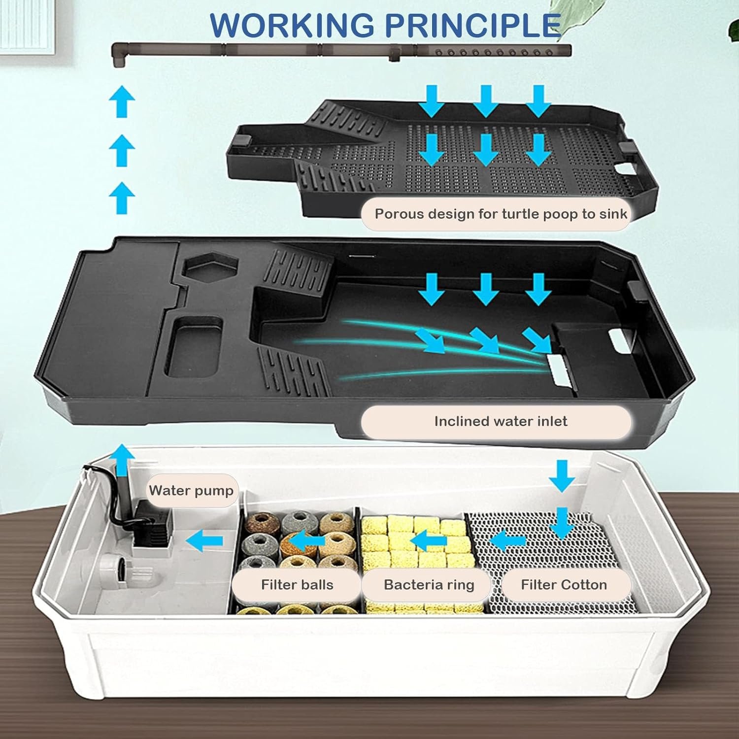 Mehrschichtiges Design: Das mehrschichtige Design der Aquarienschildkröte erleichtert die Reinigung und Pflege, sodass sie leicht zerlegt, gereinigt und wiederverwendet werden kann, um die Umgebung sauber und den Komfort der Haustiere zu gewährleisten.