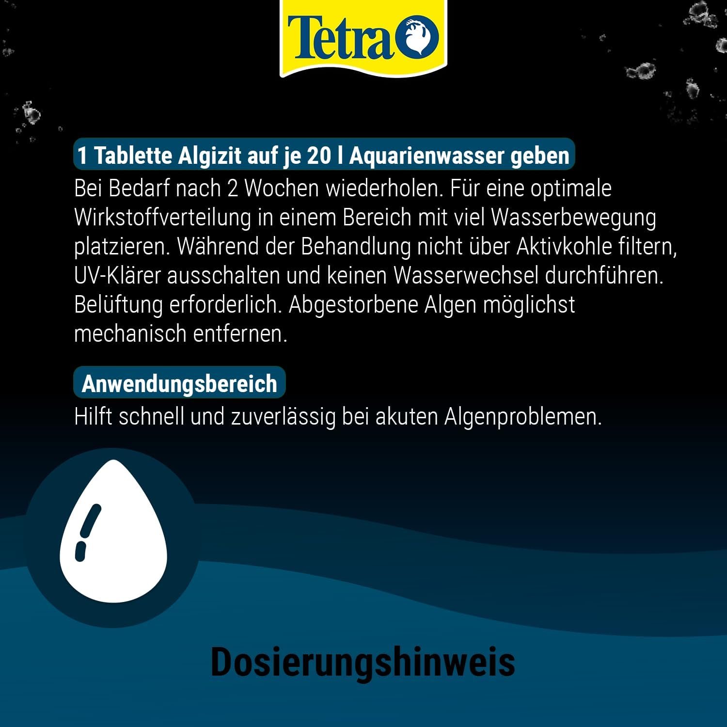1 Tablette Tetra Algizit auf 20 l Aquarienwasser geben. Bei Bedarf nach 4 Wochen wiederholen.