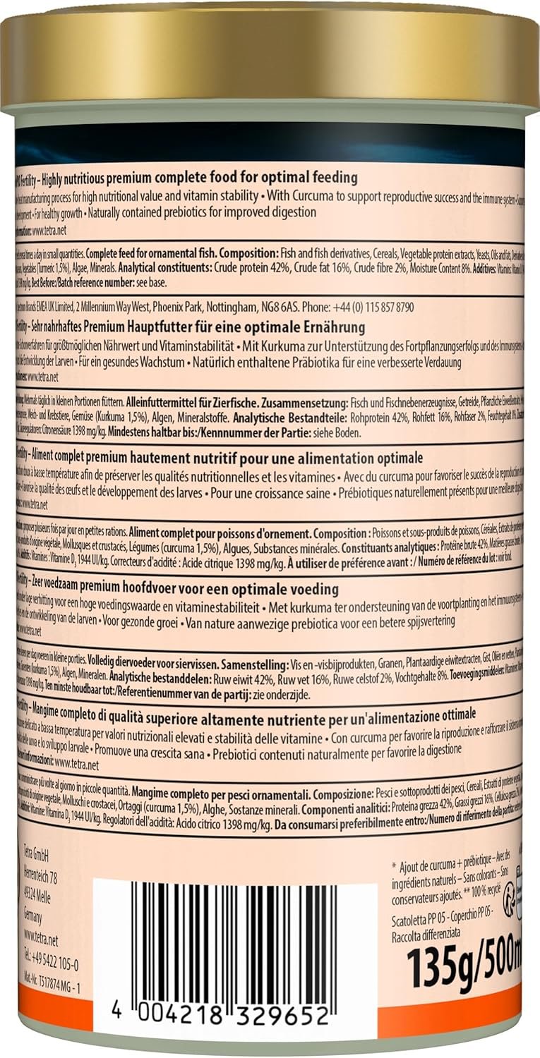 Unterstützt die Fruchtbarkeit weiblicher Zierfische und den Zuchterfolg durch spezielle Ernährung; Die Formel mit Kurkuma stärkt das Immunsystem und legt den Grundstein für eine hervorragende Eiqualität und eine starke Larvenentwicklung