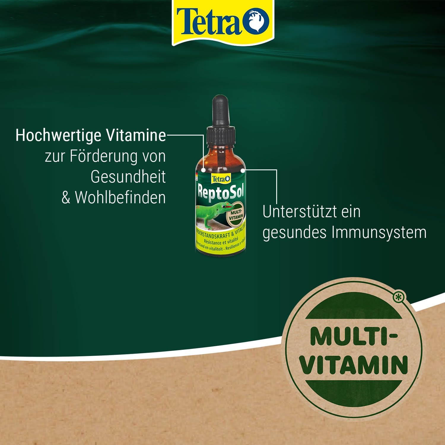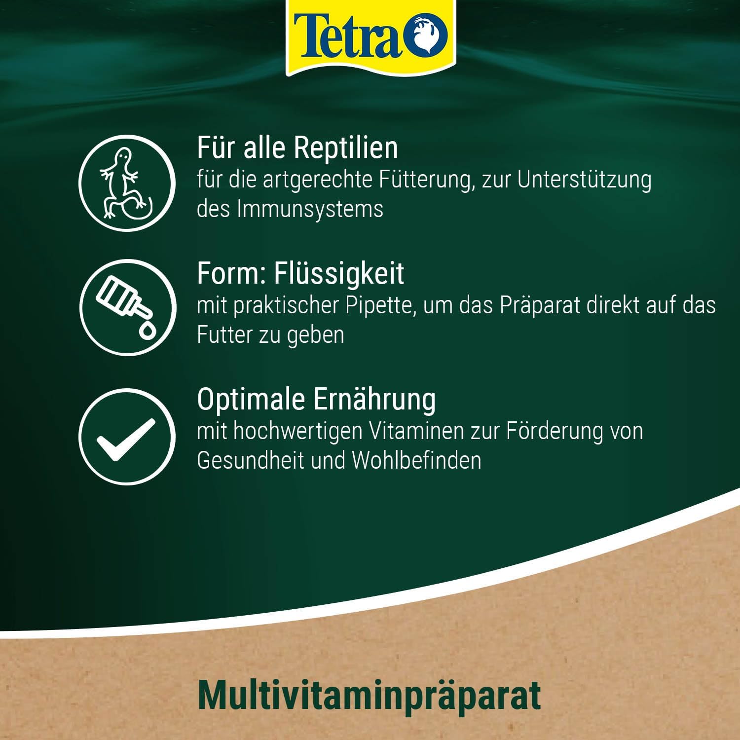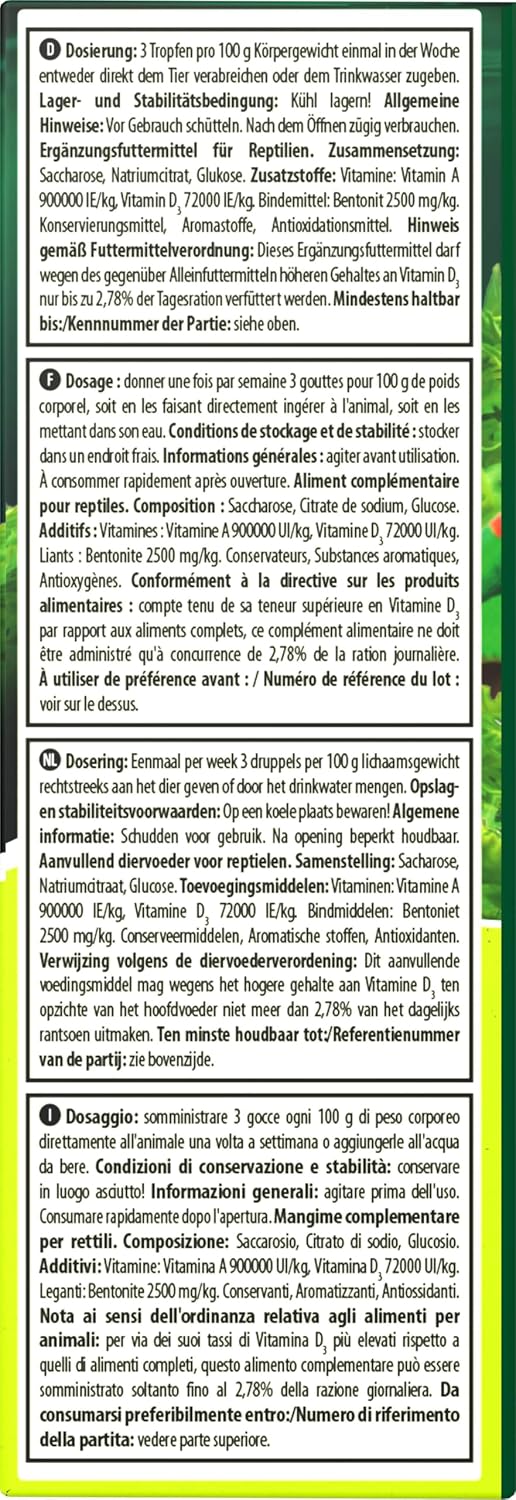 Flüssiges Multivitaminpräparat zur artgerechten Fütterung von Reptilien, unterstützt ein gesundes Immunsystem