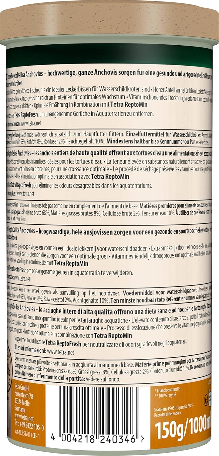 Die wiederverschließbare Dose aus recycelten Materialien schützt die Lebensmittel vor schädlichen Einflüssen wie Sonnenlicht, Luft und Feuchtigkeit – so bleiben die wichtigen Inhaltsstoffe geschützt; Lieferumfang: 1 x Tetra ReptoDelica Sardellen, 1 Liter Dose