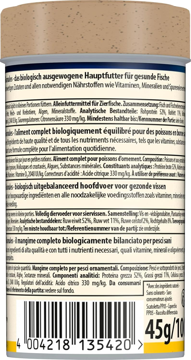Das schnell einweichende und langsam sinkende Granulat ist ideal für Fische, die in der mittleren Wasserschicht fressen, es lässt sich leicht aufnehmen und ist sehr gut verdaulich, was zu klarem Wasser und einer besseren Wasserqualität beiträgt