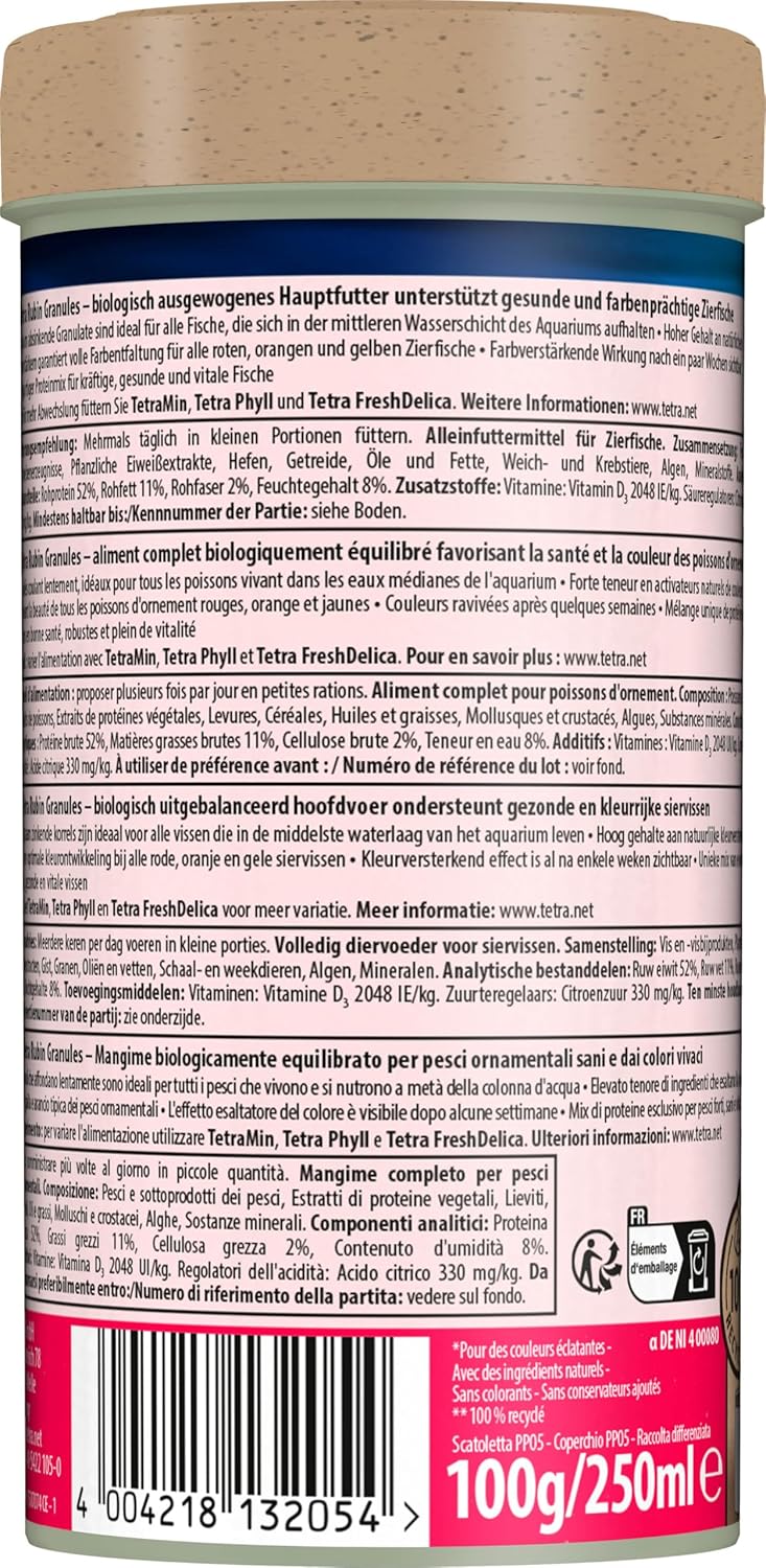 Die wiederverschließbare Dose aus recycelten Materialien schützt die Lebensmittel vor schädlichen Einflüssen wie Sonnenlicht, Luft und Feuchtigkeit – so bleiben die wichtigen Inhaltsstoffe geschützt; Lieferumfang: 1 x 250 ml Tetra Ruby Granulatfutter