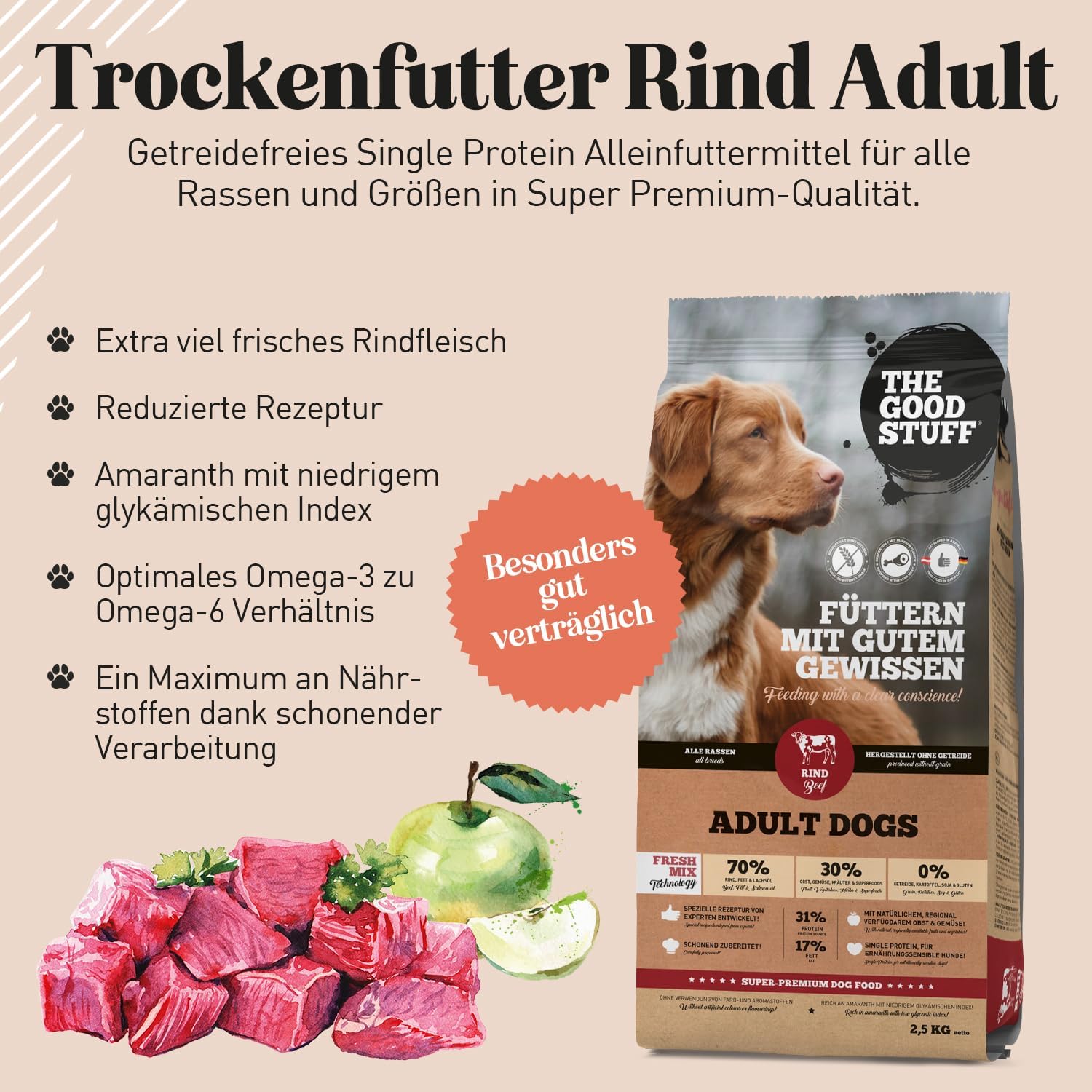 Getreidefrei und hochverträglich: Das Hundetrockenfutter Rind von Goodstuff ist komplett getreidefrei und bietet eine besonders gut verträgliche Rezeptur für ausgewachsene Hunde.