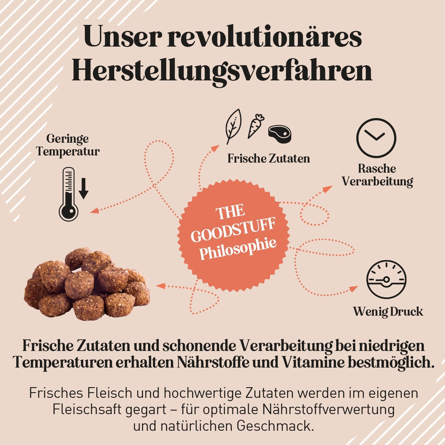 FÜTTERUNG MIT GUTEM GEWISSEN: THE GOODSTUFF steht für die Kombination aus Natur, Qualität und Verantwortung – mit frischem Fleisch, sinnvollen Zutaten und durchdachten Rezepturen für Hundefutter, das Ihrem Hund gut tut.
