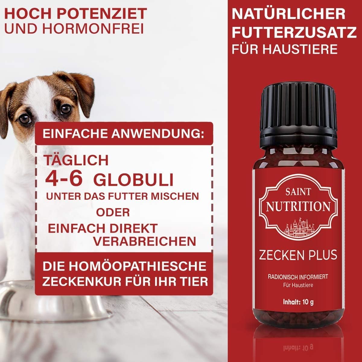 Bei Ihrem Hund entfaltet sich die Wirkung am besten, wenn Sie morgens 4-6 Globuli (je nach Gewicht) unter das Futter mischen.