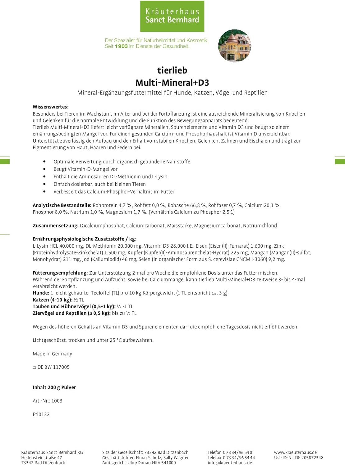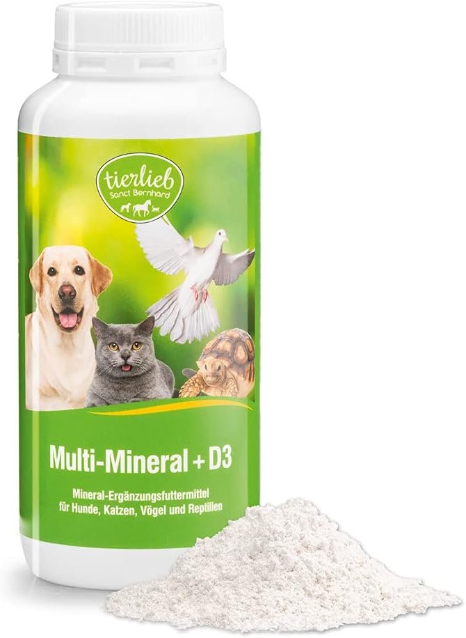 tierlieb Sanct Bernhard Multi-Mineral + D3 Ergänzungsfuttermittel für Hunde, Katzen, Vögel und Reptilien, Inhalt 200 g Pulver