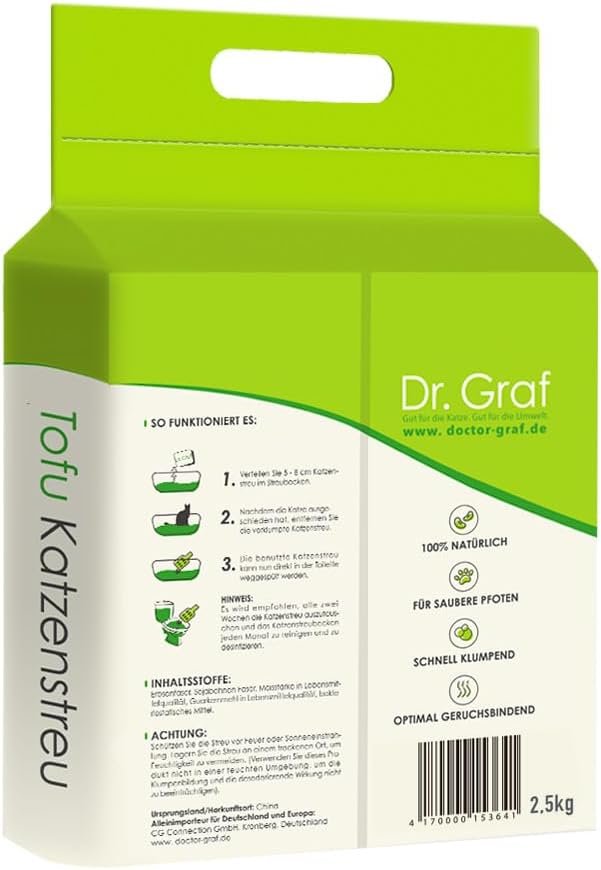 Dr. Graf Tofu Katzenstreu: Gut für die Umwelt, geruchlos, schonend für die Katzenpfoten und äußerst ergiebig. Eine ausgezeichnete Wahl für verantwortungsbewusste Katzenbesitzer und Katzenbesitzer wie Sie, die das Beste für ihre Haustiere wollen und gleichzeitig zum Umweltschutz beitragen.