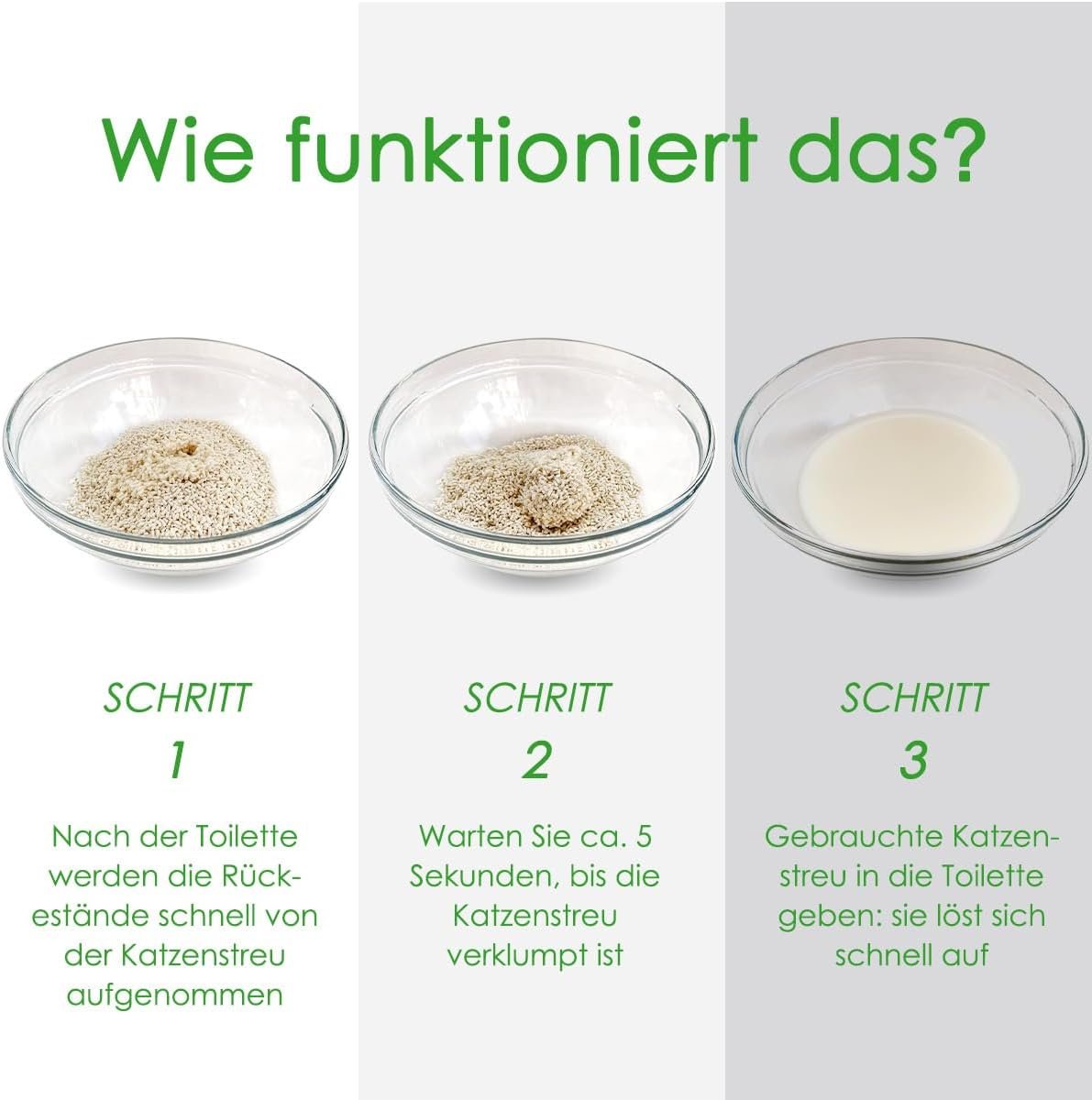 Die aus pflanzlichen Inhaltsstoffen hergestellte Streu lässt sich mit Wasser auflösen und abspülen. Die gebrauchte Streu kann direkt in die Toilette geschüttet werden.