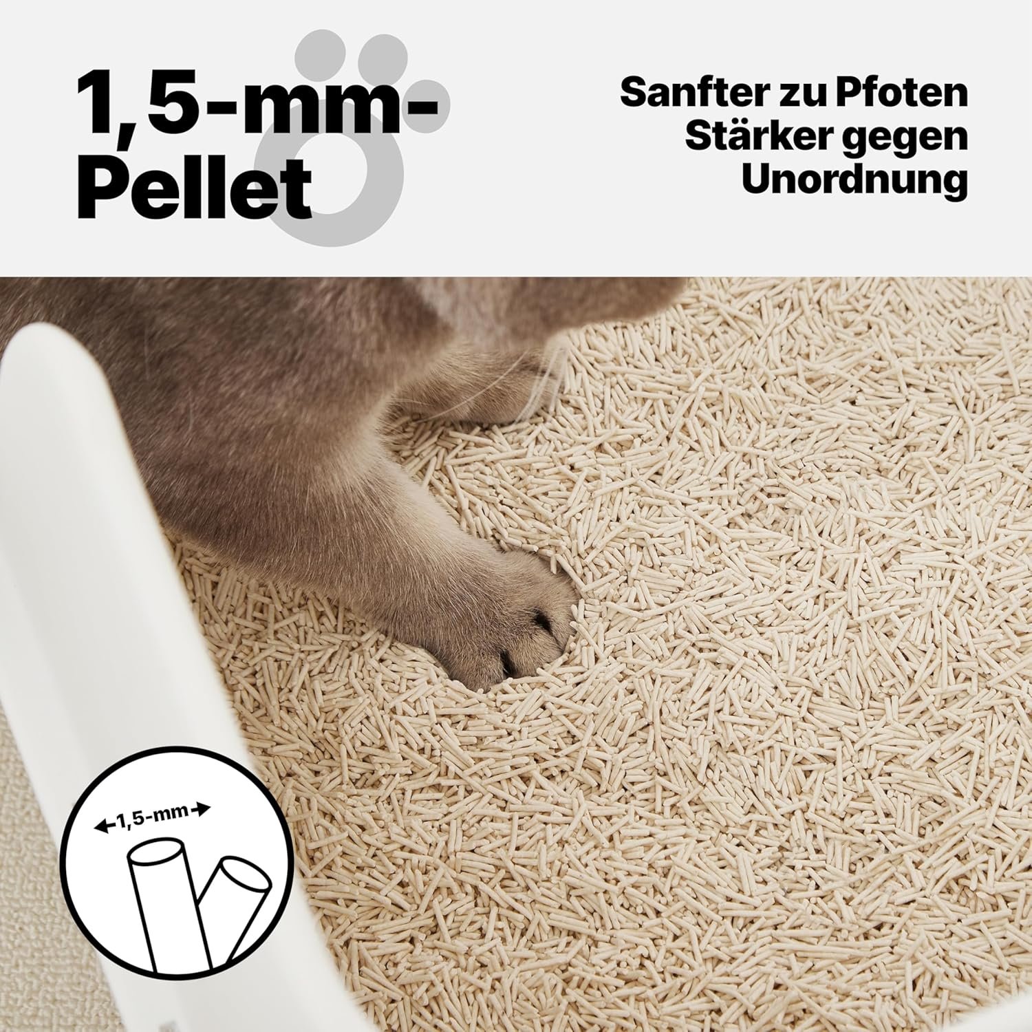 Schnelle und feste Verklumpung. Die feinen 1,5-mm-Pellets sorgen in Sekundenschnelle für eine starke Verklumpung, verhindern Fäulnis und erleichtern die Reinigung. Diese klumpende Streu eignet sich perfekt für manuelle und automatische Katzentoiletten