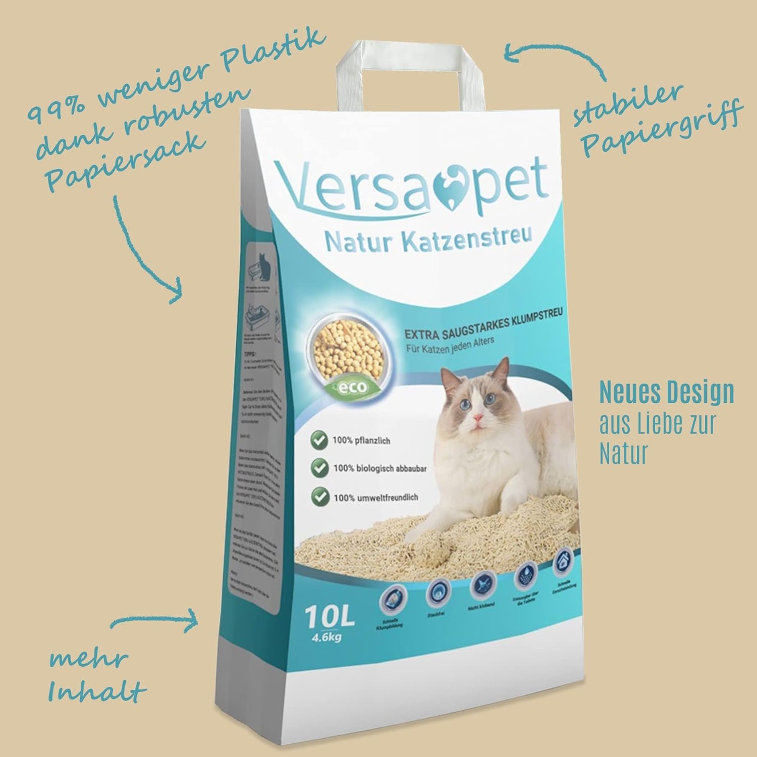 Aber nicht nur die Herstellung für unser Tofu Katzenstreu ist damit 100% nachhaltig, auch unser neues Design mit Verzicht auf 99% Plastik ist ein weiterer Beitrag die Welt ein bisschen grüner zu gestalten.