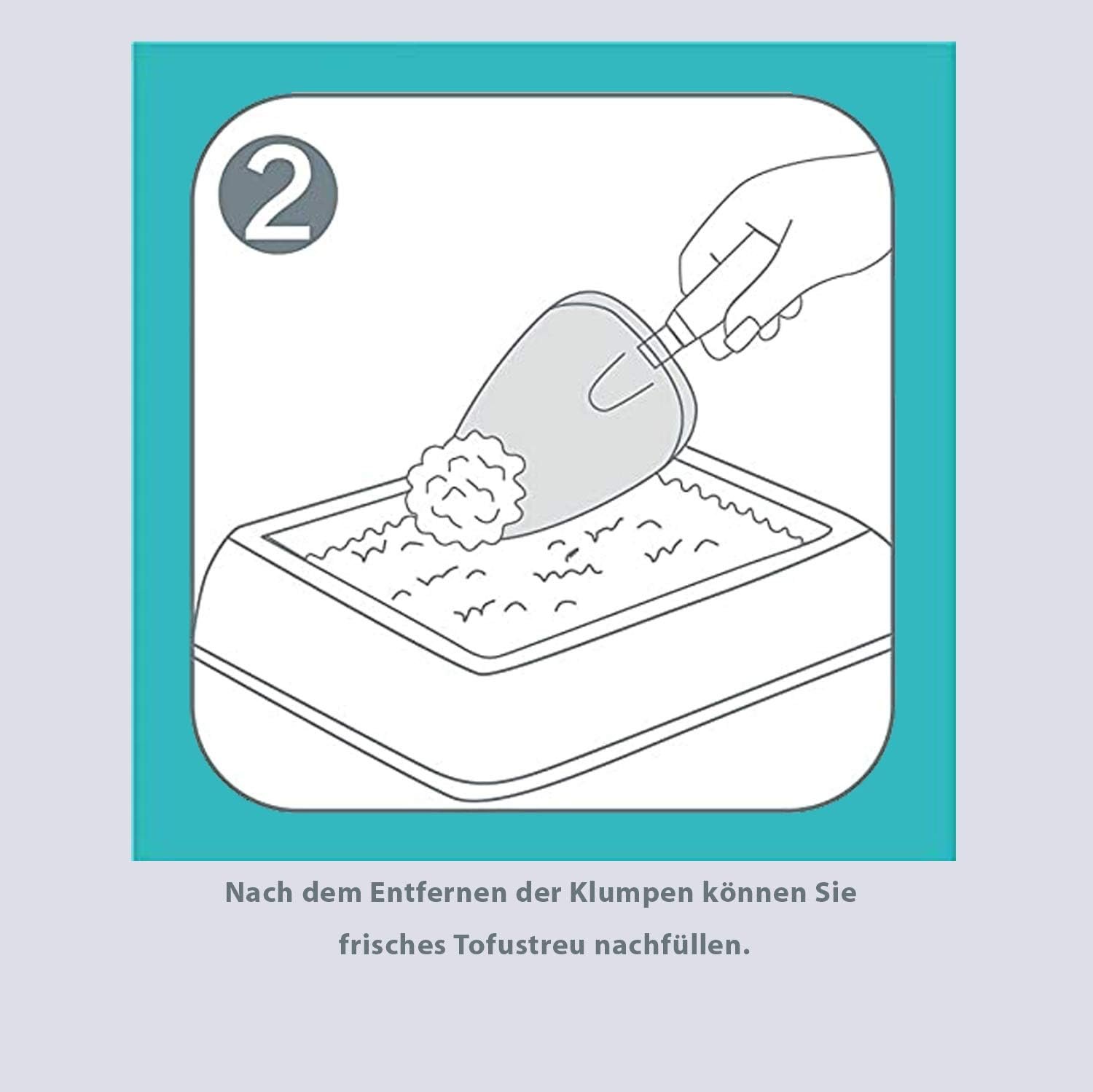 Entfernen Sie täglich die Klumpen und Kotreste mit einer Schaufel und füllen frisches Tofustreu nach.