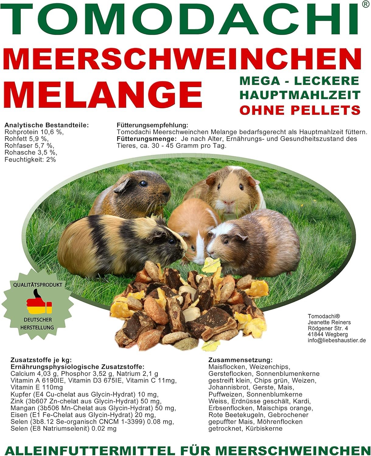 Tomodachi Meerschweinchen-Melange, pelletfrei, ist ein hochwertiges Alleinfuttermittel mit ausschließlich natürlichen Zutaten – eine vollwertige, sehr reichhaltige und abwechslungsreiche Alleinfuttermischung.