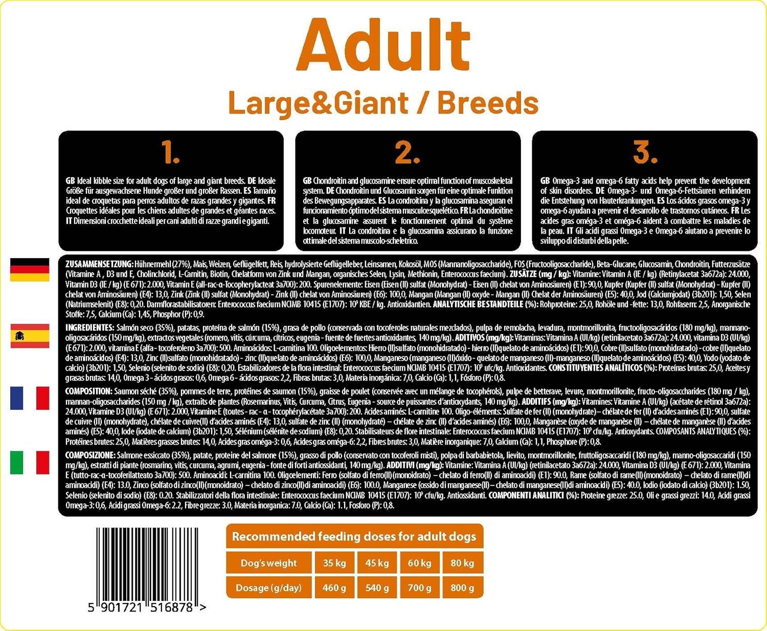 Super-Premium-Trockenfutter für ausgewachsene Hunde großer und riesiger Rassen. Solche Hunde können Probleme mit dem Bewegungsapparat und dem Verdauungssystem haben. Diese Formel hält Ihren Hund in einem sehr guten Zustand.
