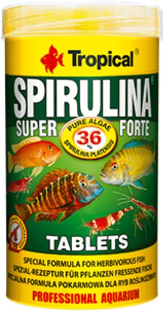 Super Spirulina Forte Tabletten ist ein spezielles, pflanzliches Alleinfuttermittel in Form von Hafttabletten mit einem hohen Anteil (36 %) an der Alge Spirulina platensis. Es wird besonders für junge afrikanische Buntbarsche empfohlen. Spirulina-Algen wirken sich positiv auf den Stoffwechsel aus, stärken das Immunsystem und begünstigen durch ihren Gehalt an natürlichen Carotinoiden Verfärbungen. Fütterung: Bringen Sie 2–5 mal täglich eine oder mehrere Tabletten (abhängig von der Anzahl der Fische) an der Innenseite der Aquariumscheibe an oder lassen Sie sie in das Aquarium fallen, in dem die Fische gefüttert werden. Alleinfuttermittel für Zierfische. Zusammensetzung: Algen (Spirulina platensis mind. 36 %), pflanzliche Nebenerzeugnisse, pflanzliche Eiweißextrakte, Fisch und Fischnebenerzeugnisse, Weich- und Krustentiere, Getreide, Milch und Milchprodukte, Fleisch und tierische Nebenerzeugnisse, Hefen, Öle und Fette, Mineralstoffe. Zusatzstoffe: Vitamine, Provitamine und chemisch definierte Stoffe mit ähnlicher Wirkung: Vit. A 21.000 IU/kg, Vitamin D3 1 150 IU/kg, Vitamin E 70 mg/kg, Vitamin C 295 mg/kg Verbindungen von Spurenelementen: E1 Eisen 25,4 mg/kg, E6 Zink 6,7 mg/kg, E5 Mangan 5,4 mg/kg, E4 Kupfer 1,3 mg/kg, E2 Jod 0,15 mg/kg, E8 Selen 0,15 mg/kg, E7 Molybdän 0,03 mg/kg. Lecithin-Farbstoffe, antioxidativ. Analytische Inhaltsstoffe: Rohprotein 45,0 %, Rohöle und -fette 5,6 %, Rohfaser 3,0 %, Feuchtigkeit 9,0 %.