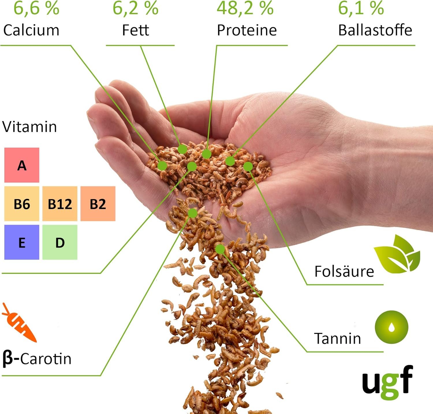 48 % Protein – Gammarus getrocknet ist eine ideale Ergänzung zu einer ausgewogenen Ernährung von Tieren. Im Vergleich zu anderen Insektenarten enthält es eine große Menge an Vitaminen, Kalzium, β-Carotin, Folsäure und Tannin. Es bietet eine abwechslungsreiche Ernährung für Haustiere und unterstützt so die Gesundheit erwachsener Tiere und die Entwicklung junger Tiere.