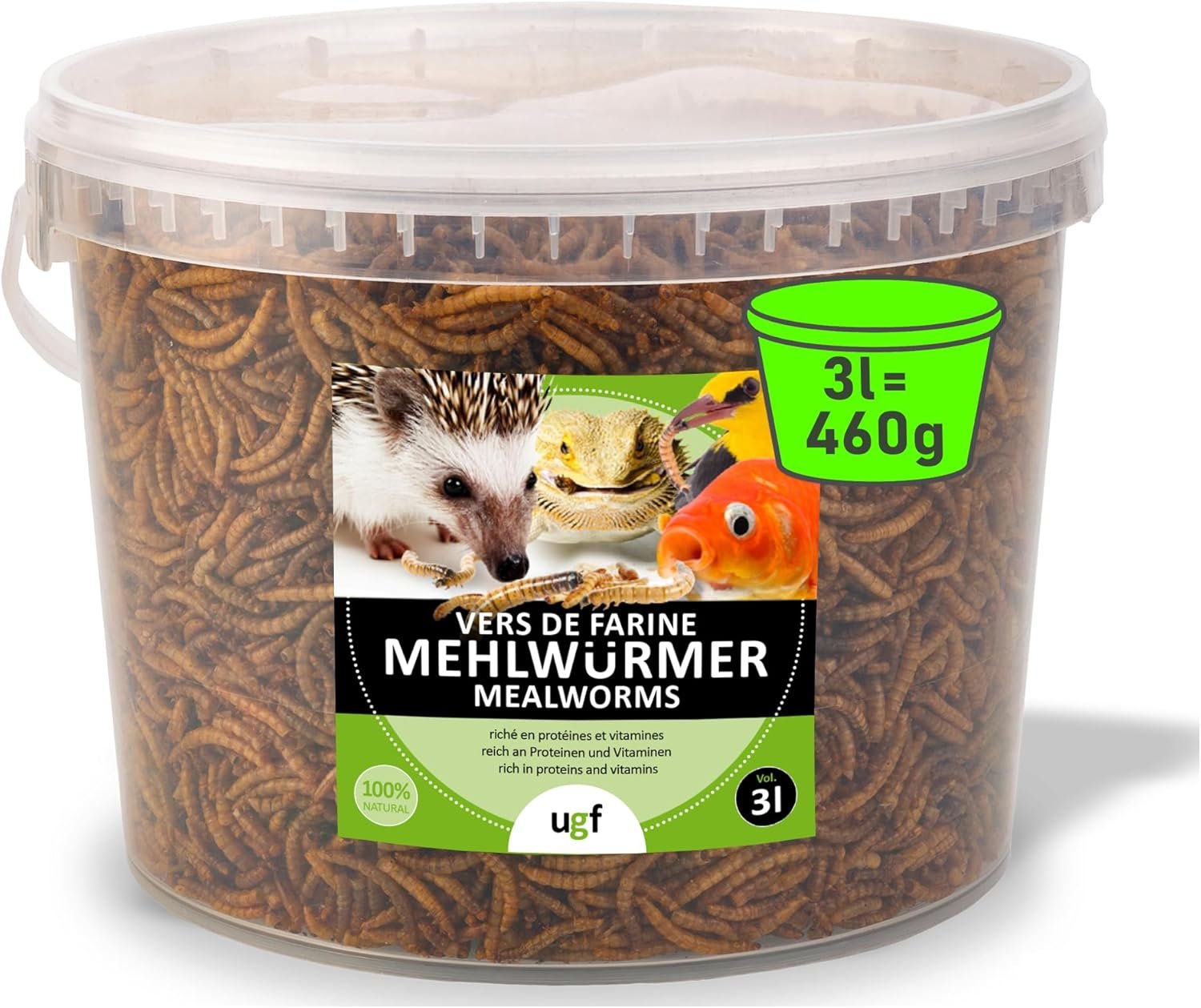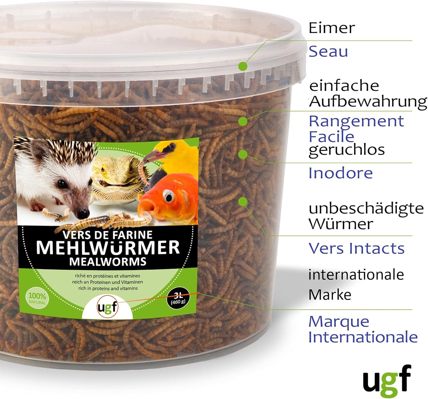100 % natürlich – Unser getrocknetes Insekt ist ein 100 % natürliches Produkt ohne Konservierungsstoffe und Farbstoffe. Verpackt ist es in einem recycelbaren 3-Liter-Eimer, weshalb man es gut lagern kann, es stinkt nicht, die Würmer bleiben am Stück und in höchster Qualität.