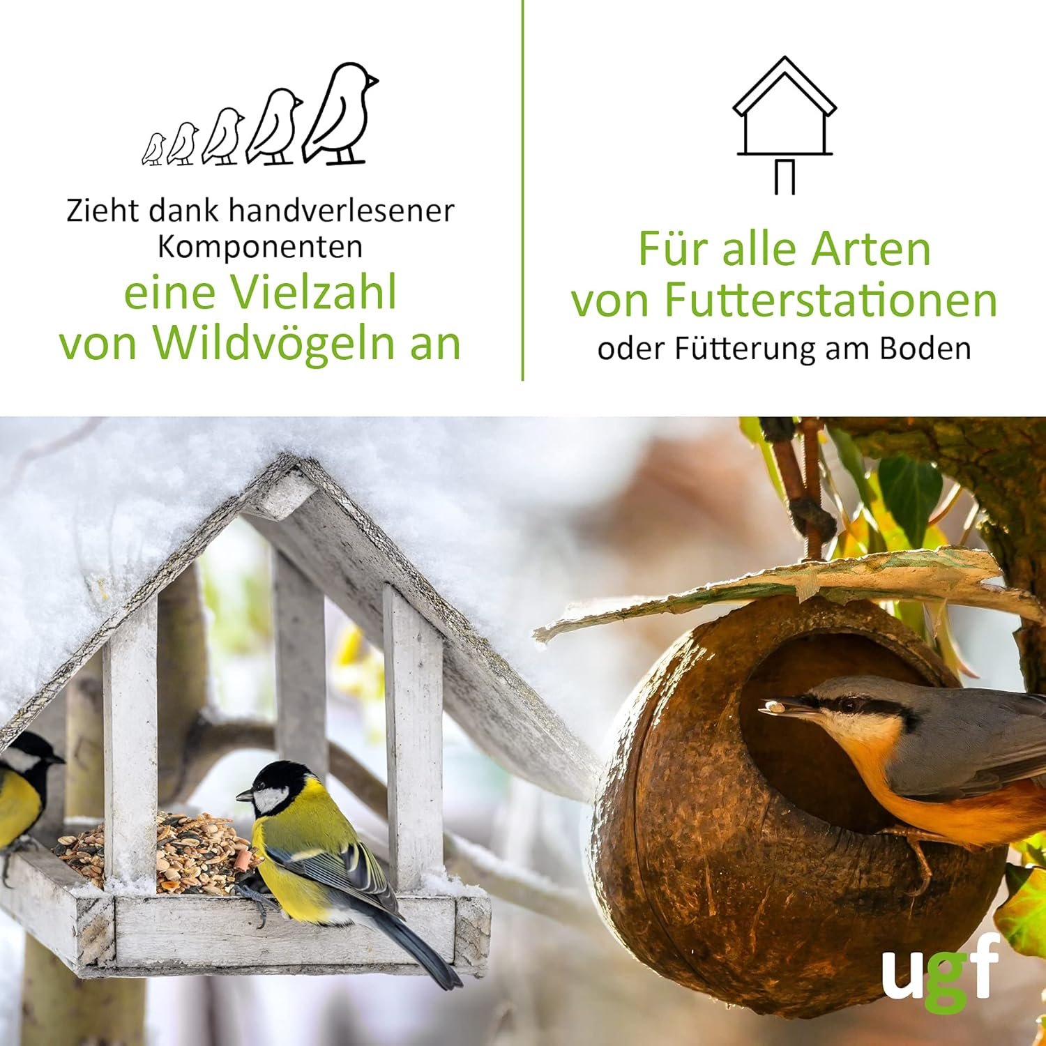 Einzigartige Mischung – im Vergleich zu anderen Mischungen ist das Verhältnis von Proteinen, Fetten, Vitaminen und Mineralstoffen ausgewogener und vielfältiger. Dies ermöglicht eine abwechslungsreiche Ernährung verschiedener Vogelarten, aber auch anderer Tiere. Es kann sowohl in jedem Futterhäuschen als auch auf dem Boden serviert werden. 11 Zutaten sorgen dafür, dass jede Vogelart ihre Lieblingszutat findet und sich nicht mehr davon lösen kann.