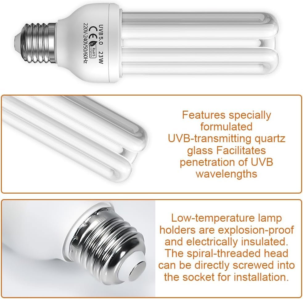 Standard-E27-Fassung: Einfache Installation dieser UVB 5.0-Vogellampe in Leuchten in Standardgröße. Einfache Installation, hohe Praktikabilität. Unabhängig davon, ob Sie eine alte Lampe austauschen oder eine neue Lampe installieren, schrauben Sie die neue Lampe einfach in den E27-Sockel, um eine einfache und effiziente Installation zu ermöglichen.