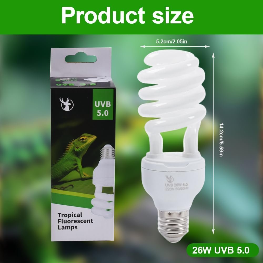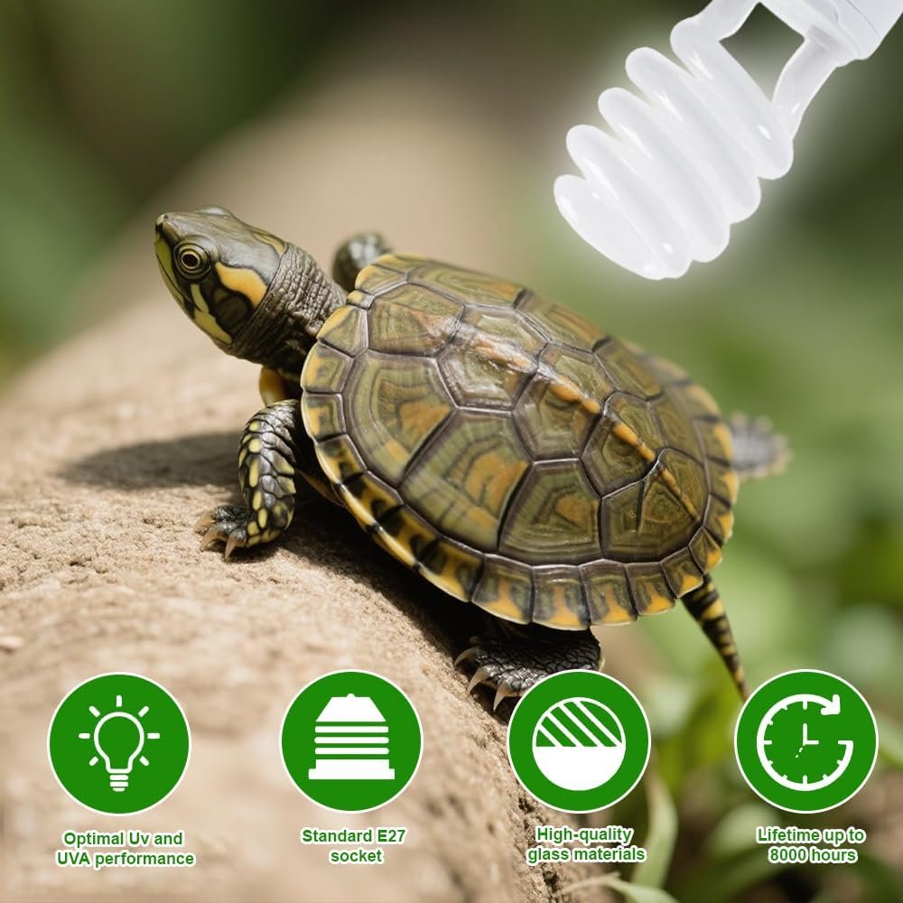 UVB-Lampen-Terrarium wurde entwickelt, um echtes Sonnenlicht zu simulieren und strahlt UVA-Strahlen aus, die den Appetit und das natürliche Verhalten anregen, sowie UVB-Strahlen, die die Vitamin-D3-Synthese und die Kalziumaufnahme fördern. Ideal für Schildkröten, Leguane, Eidechsen, Schlangen, Chamäleons und andere tagaktive Reptilien. Mit ihrem E27-Standardgewinde lässt sie sich problemlos in jede Lampenfassung einschrauben. Das kompakte, langlebige Design macht sie zur perfekten Wahl für Terrarien, Vivarien und kontrollierte Umgebungen.