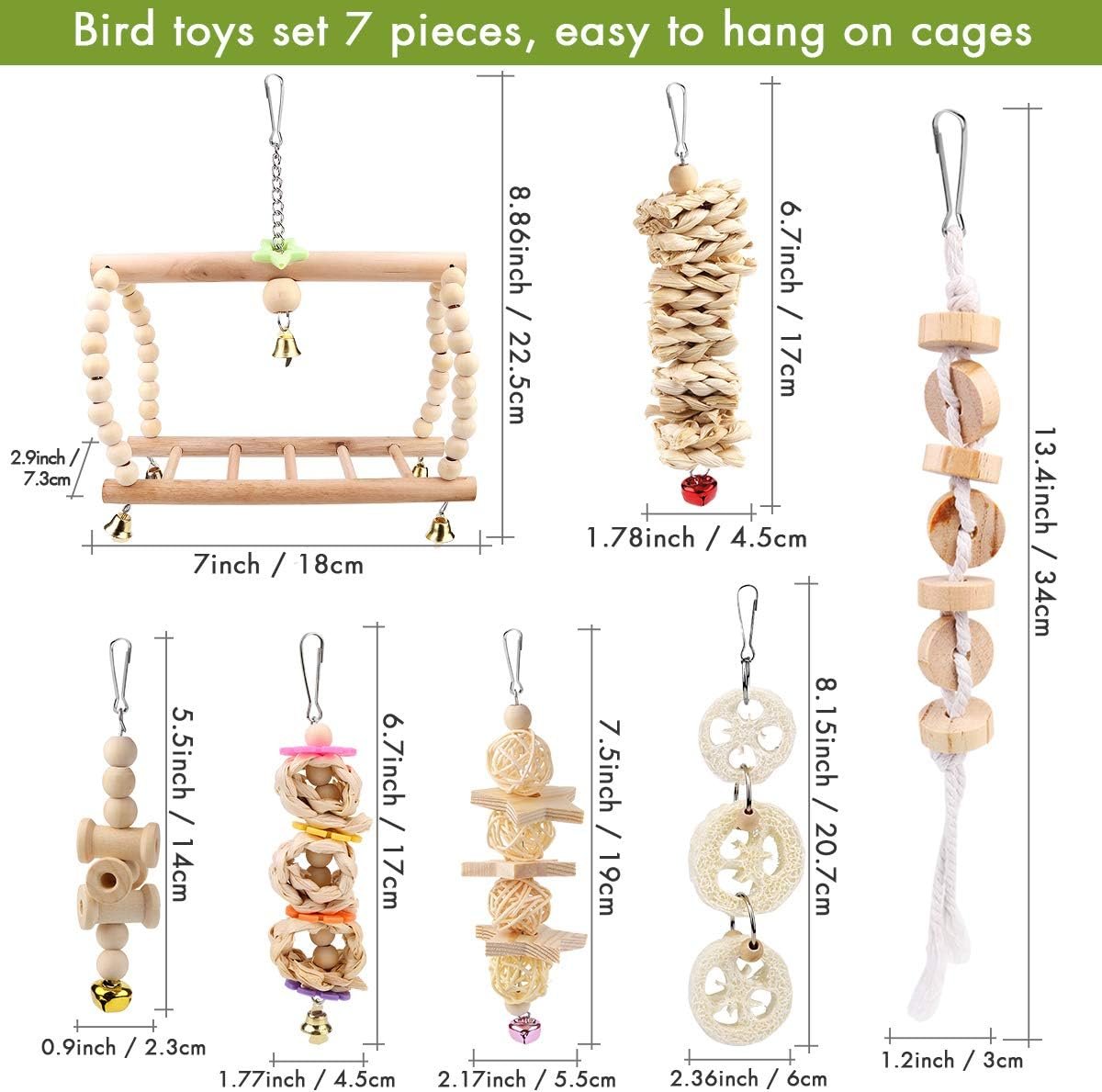 Natürliche Holzfarben: aus Naturholz und Seil, 100 % sicher und ungiftig. Das Vogelspielzeug-Set enthält 7 Packungen verschiedener Arten von Kauschaukelspielzeugen für Vögel.