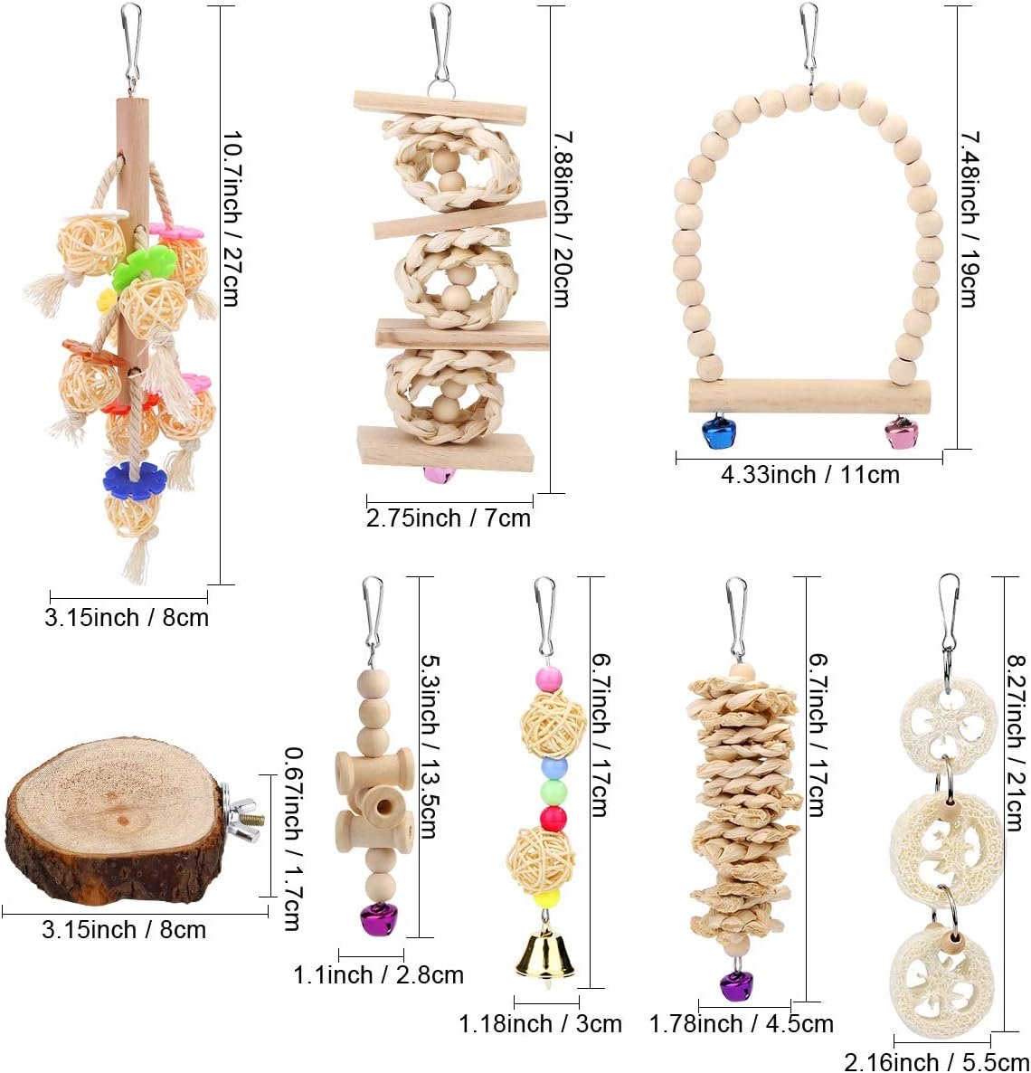 Natürliche Holzfarben: aus Naturholz und Seil, 100 % sicher und ungiftig. Das Vogelspielzeug-Set enthält 8 Packungen verschiedener Arten von Vogel-Kauschaukelspielzeugen.