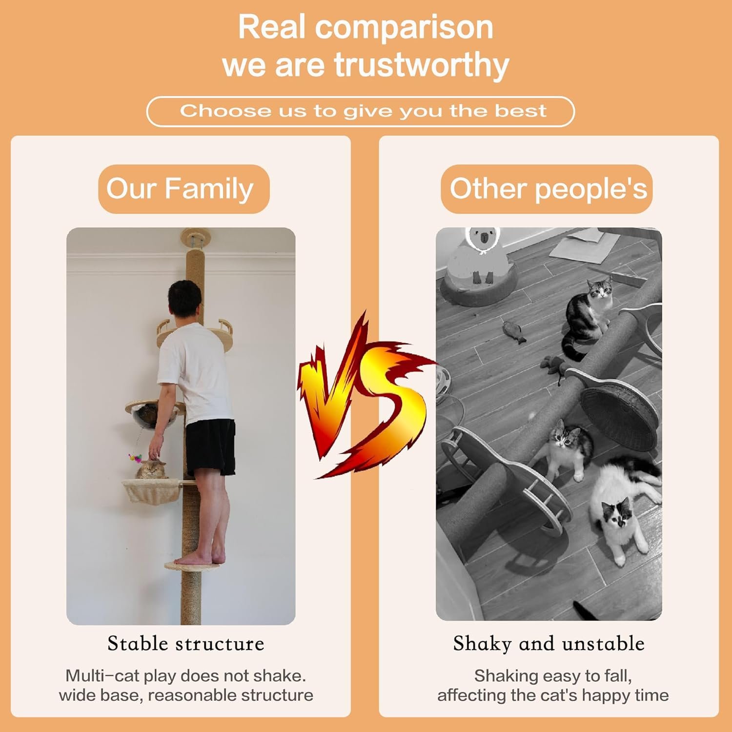 Bei raumhohen Katzentürmen wird Sicherheit und Stabilität groß geschrieben: Verstärkte Kratzbaumbasis, 3 Befestigungen oben und flexible Verstellung der 8 Stangen sorgen für die Stabilität des Kratzbaums. Der sicher installierte Kratzbaum kann für Haushalte mit mehreren Katzen bis zu 150 Pfund tragen