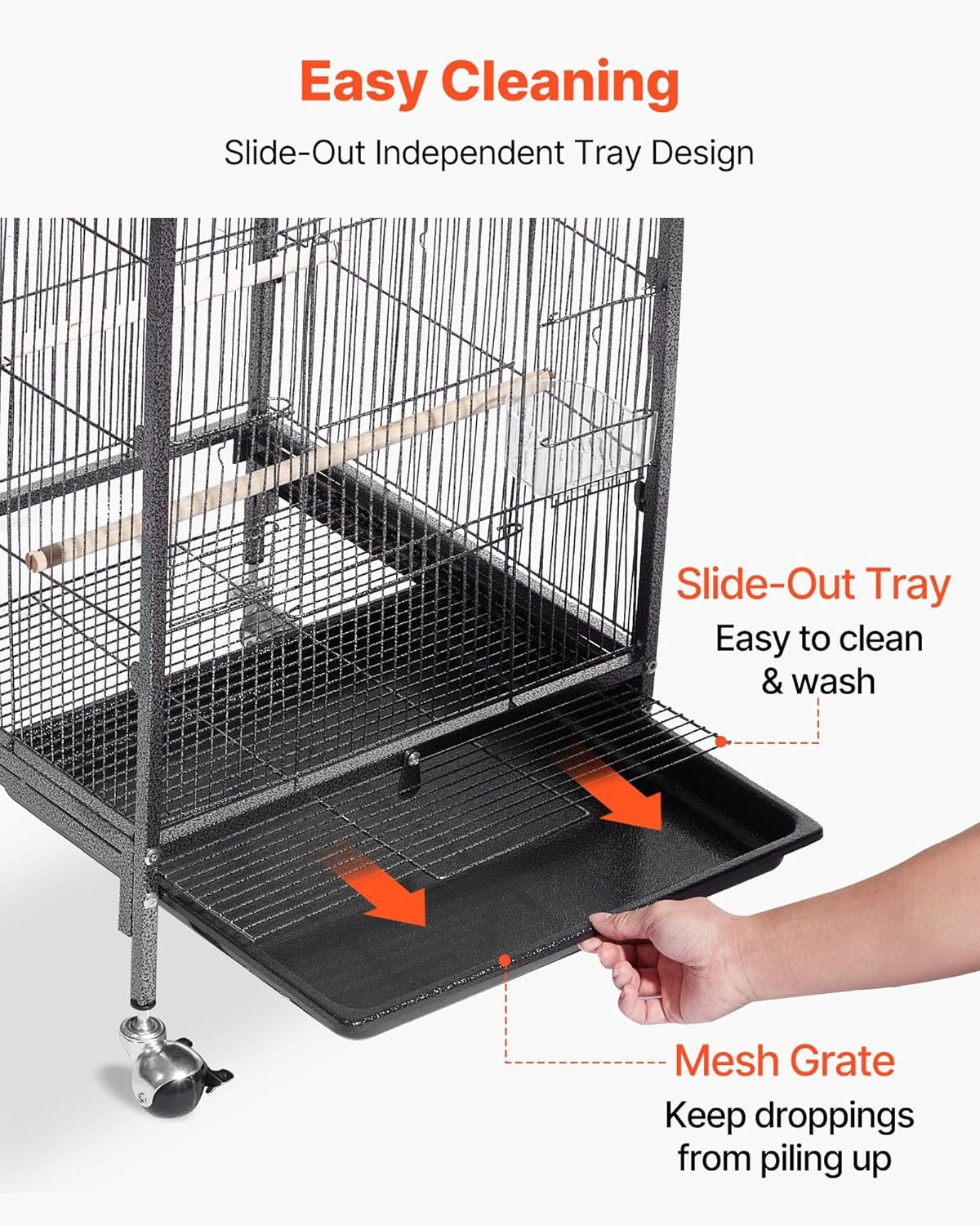 Ausgestattet mit vier robusten Rollen lässt sich unser Papageienkäfig leicht bewegen und überallhin mitnehmen. Die herausziehbare Schublade ist einfach zu reinigen, und das Drahtgitter trennt Tiere und Ausscheidungen, sodass sich kein Kot ansammelt und stets für Sauberkeit und Frische gesorgt ist.